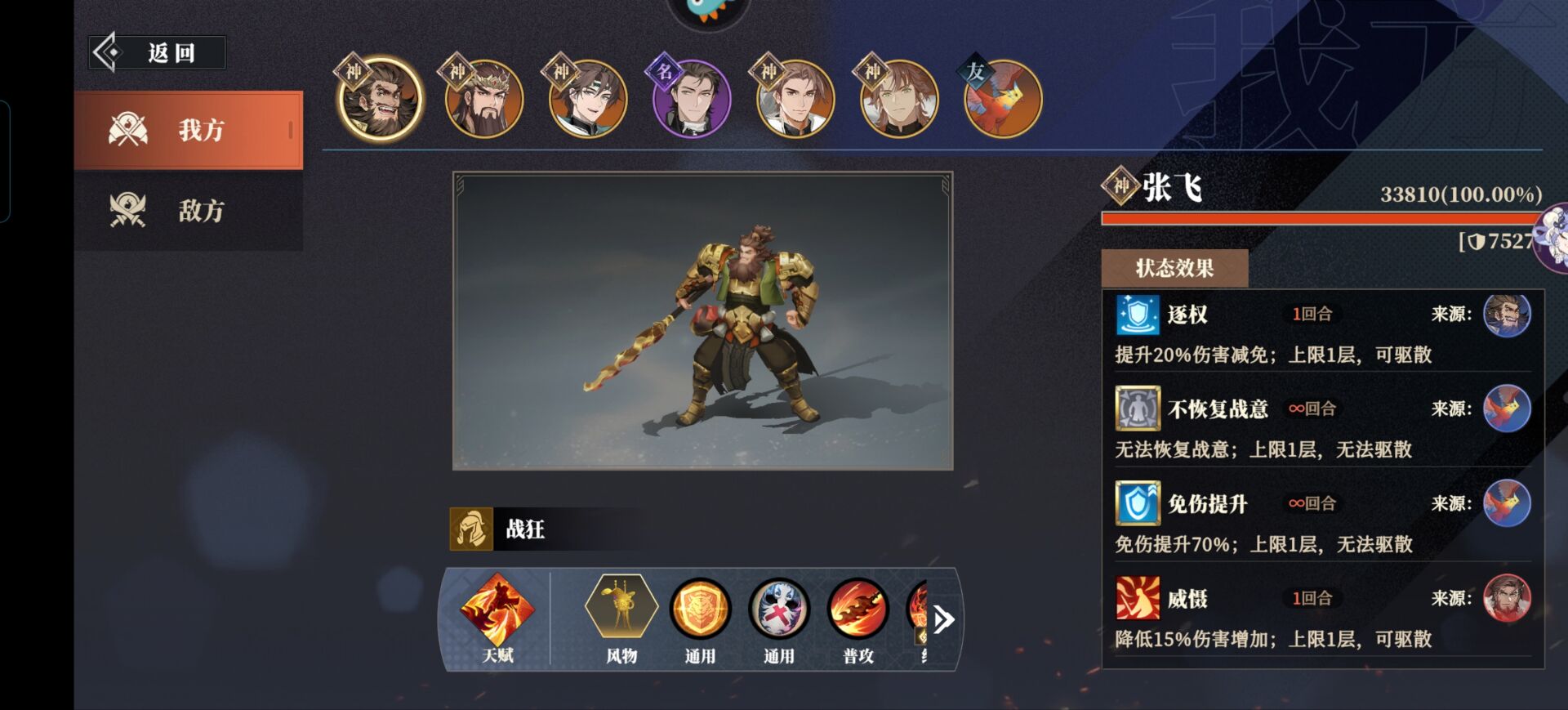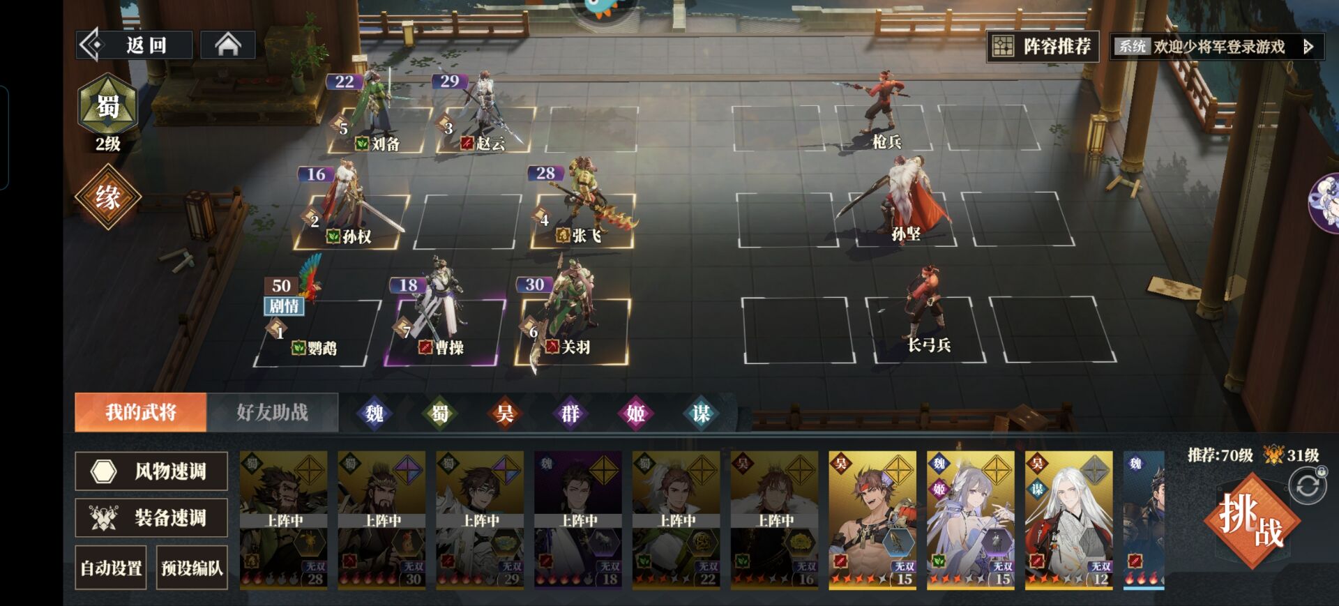 打法思路:张飞和刘备放中间一列,这两个被孙坚优先挂【威慑】没事,记得威慑状态下别打孙坚就行。