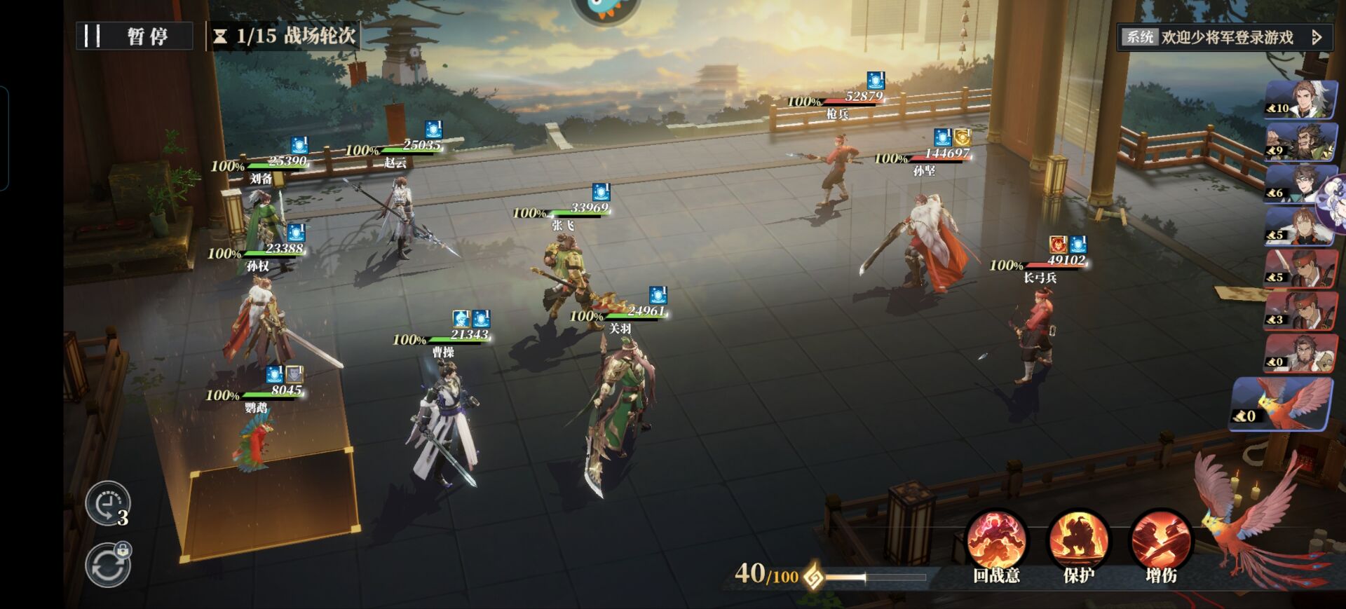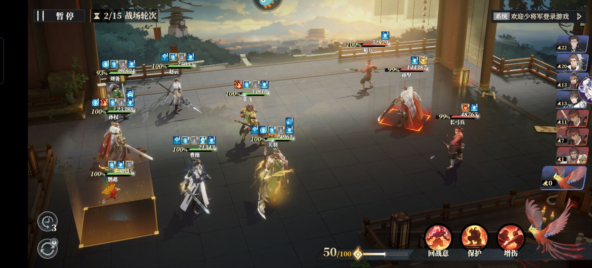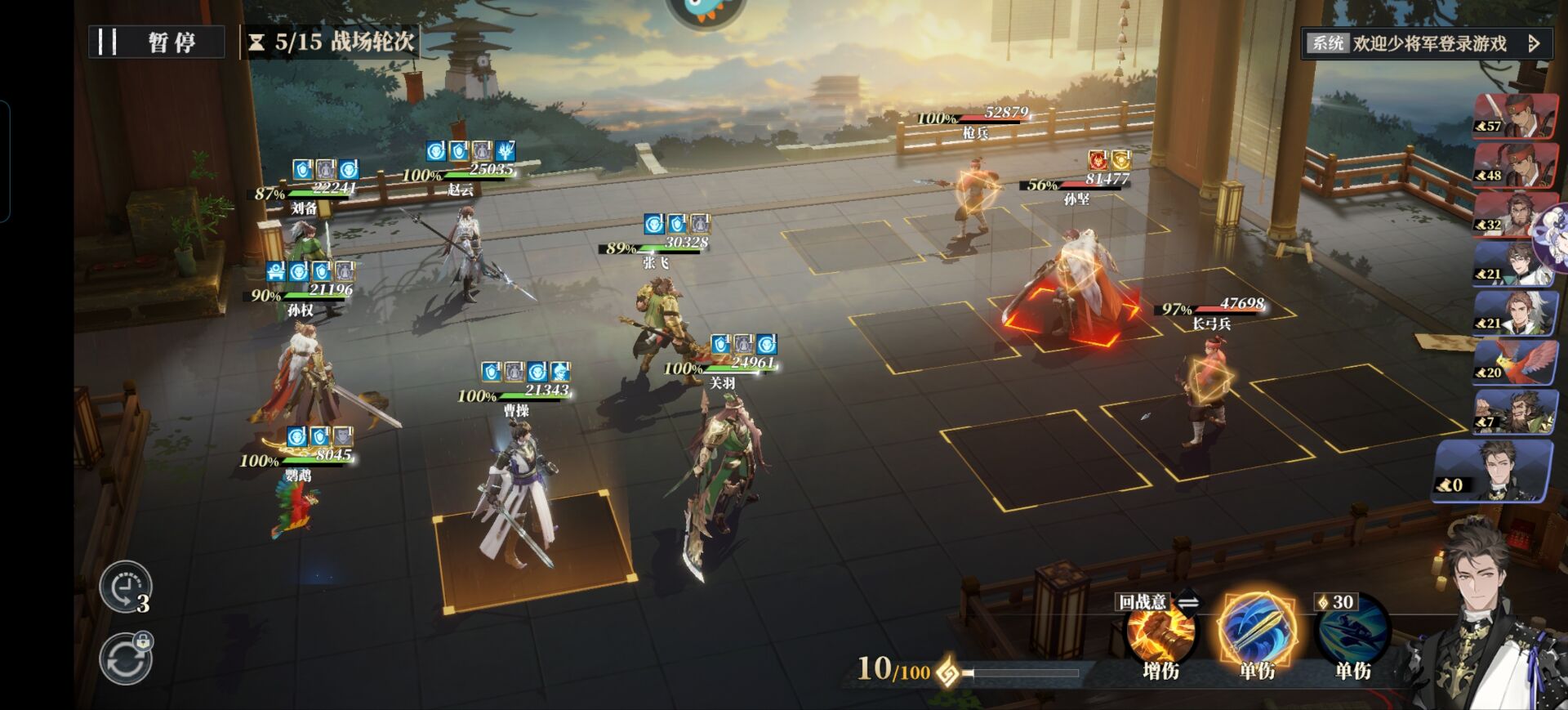 关羽和赵云也是一样的【威慑】状态下别打孙坚,打他旁边的两个小兵即可!