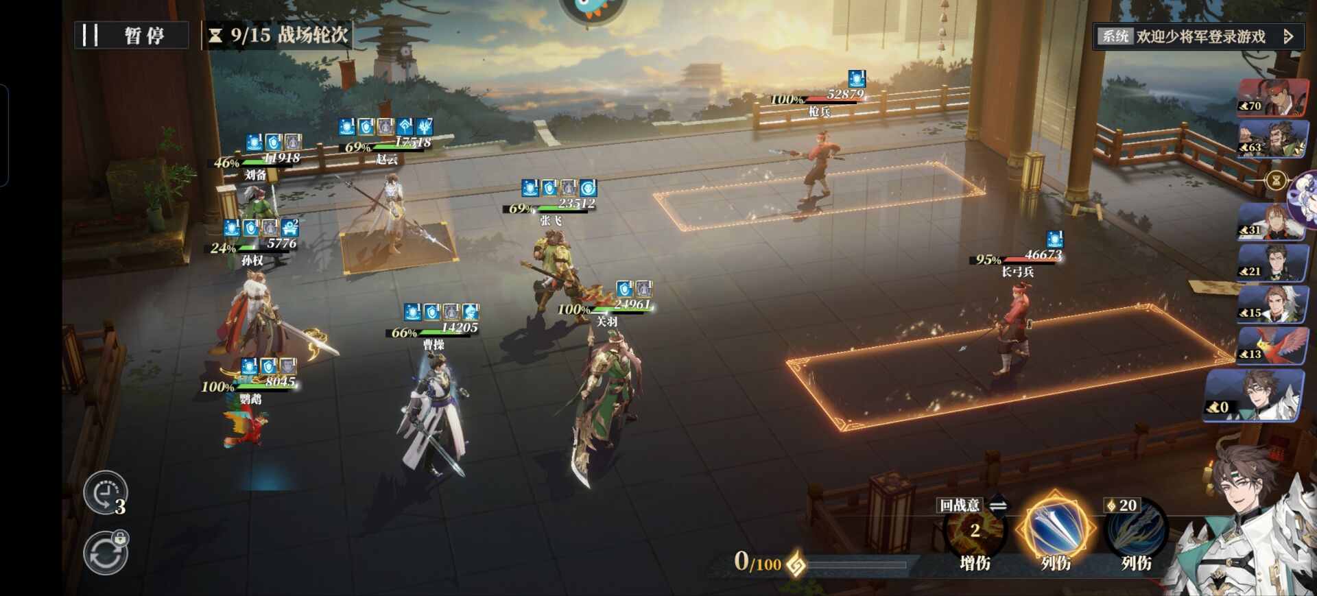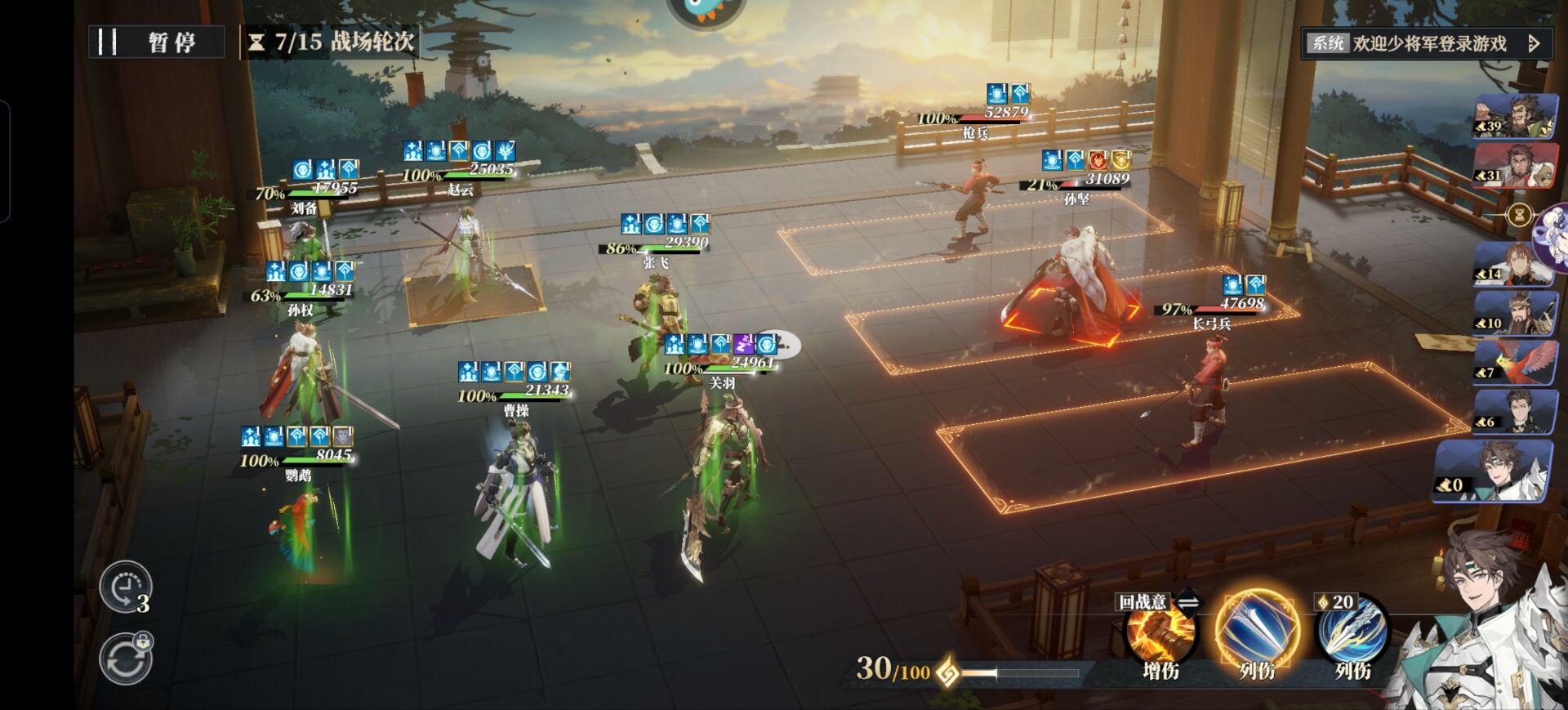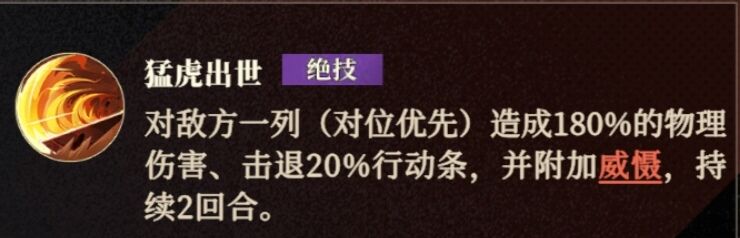 他的绝技是优先攻击中间一列的目标,因此我们中间可以不放输出武将,把输出武将放在两边就可以优先避免我们的输出武将被挂上【威慑】对吧!有没有道理!非常好用的思路。
