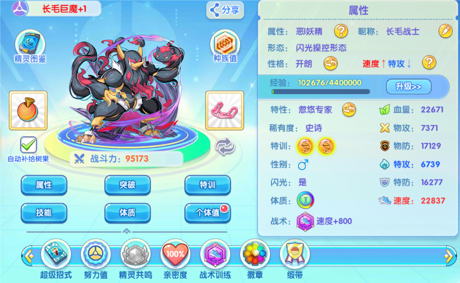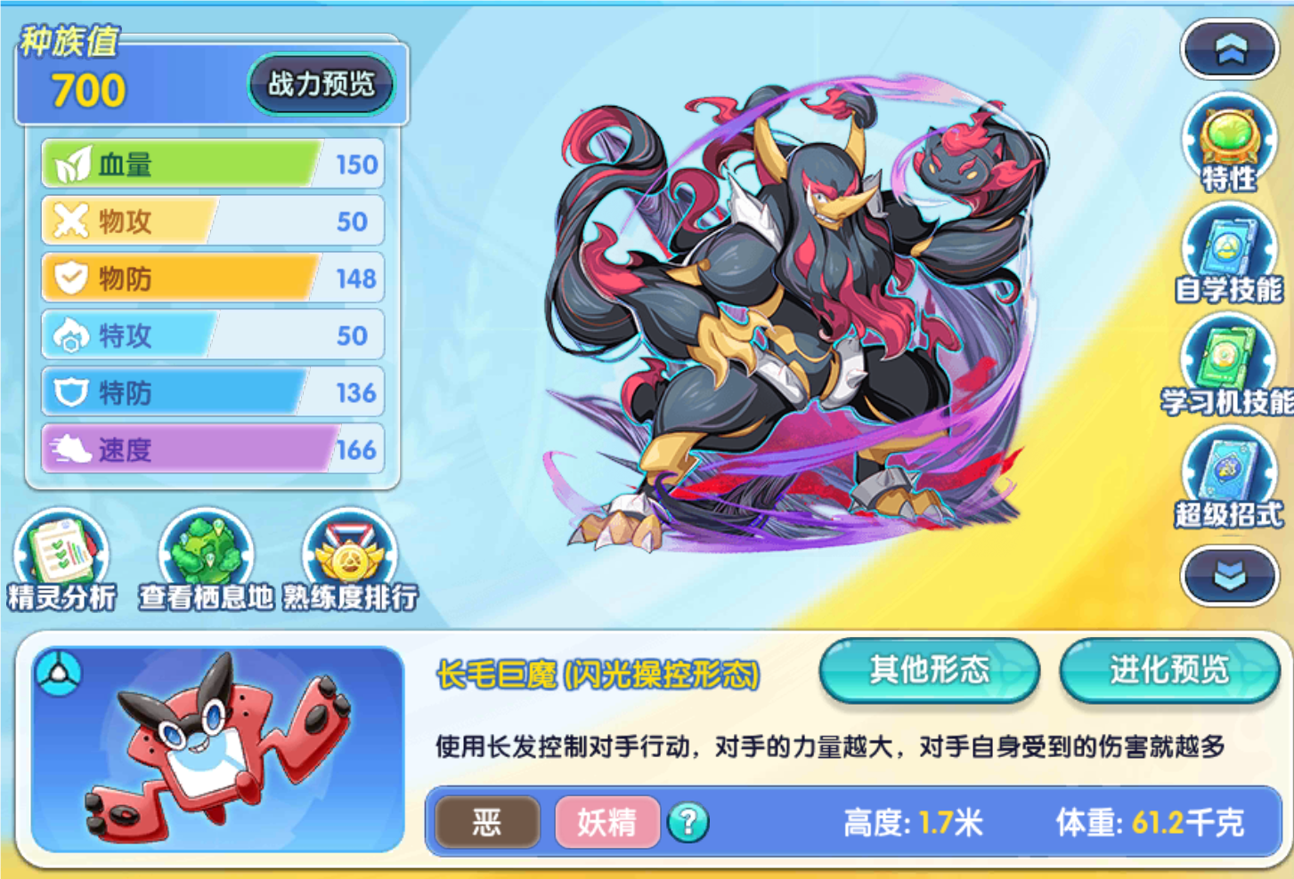 性格:开朗、淘气、慎重、大胆、沉着、悠闲、狂妄,努力值:血量物防、血量特防、血量速度,道具:火炬杯锁链、幸运饺子、后攻之爪,特性:忽悠专家,特殊系统:超级鬼脸、超级落拳
