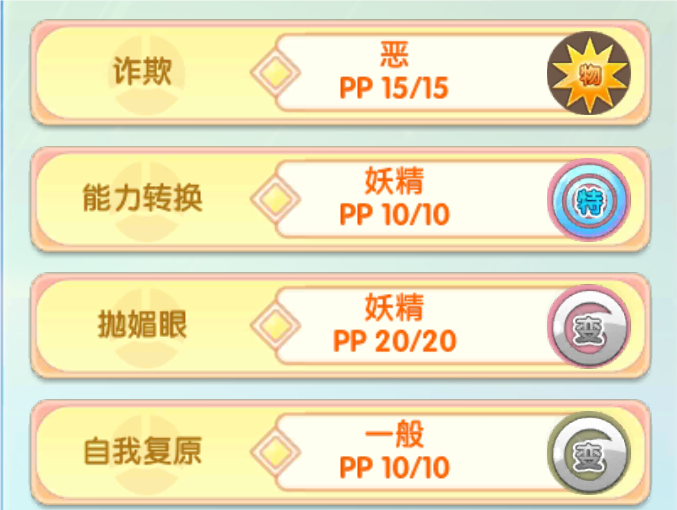 不过我推荐的是自我复原,因为次数多,还有一个技能我是比较推荐的就是这个诈欺这个技能的效果是根据对方的物理面板来进行伤害计算的,只要对方的物理伤害很高,该技能的威力就越大,在以前版本的时候,这个技能可以说是神技了,特别是给肉盾使用,专门反手克制物攻输出,基本上也是推荐大家使用这个技能的,专门反手克制一些物理输出,至于还有两个技能的话,就是抛媚眼和这个能力转换,前者是干扰和中转,但是缺点的话就是由于自身速度过快的原因,可能会导致先手那么这样的话,在性格和努力方面的话,可以考虑增加防御力,然后速度减速,这样能够保证比一些高速宠物要慢,但是也慢不了多少,还是会比一些辅助宠物要快,所以无论是先手还是后手,都是可以用的,如果想要本身的速度不低,还要保证技能后手发动的话,可以考虑一些特殊的道具(后攻之爪)