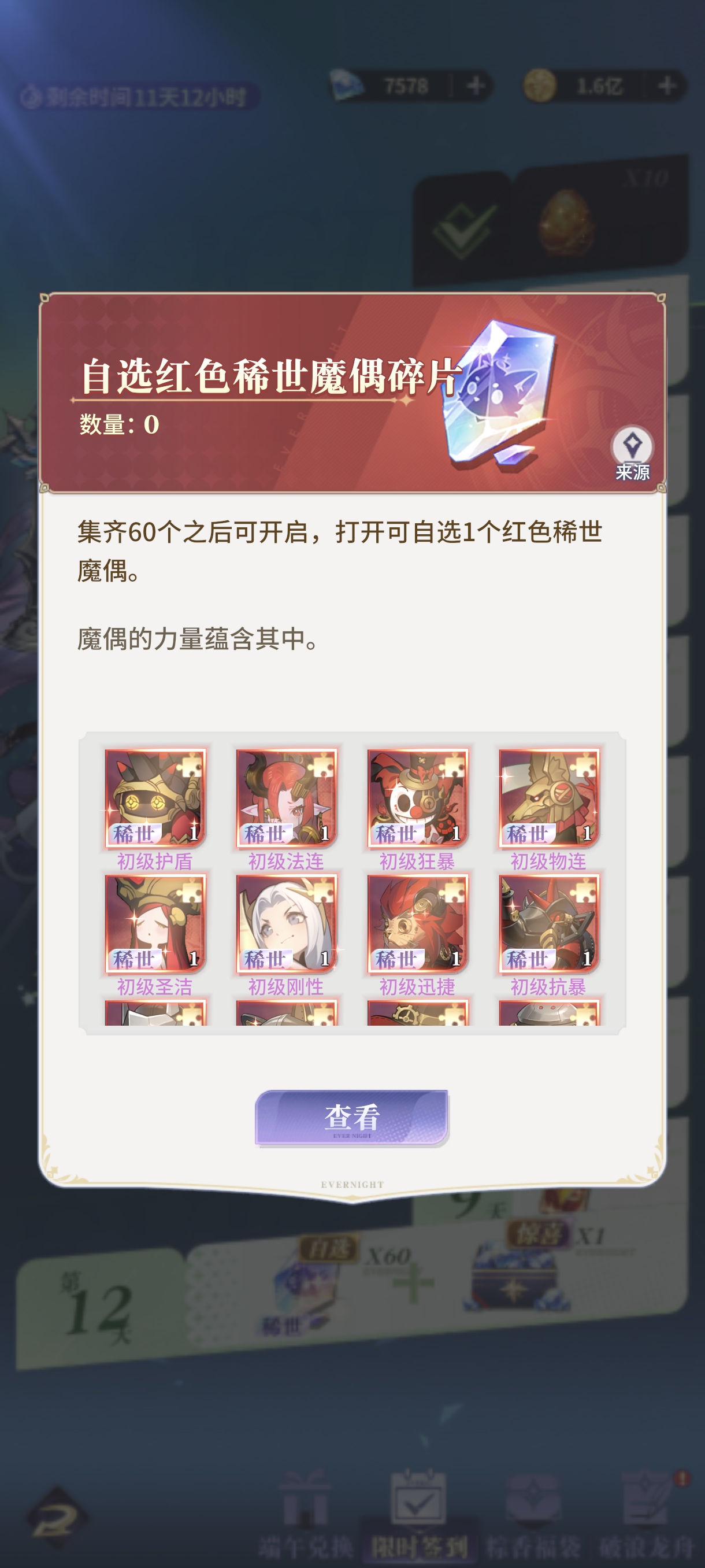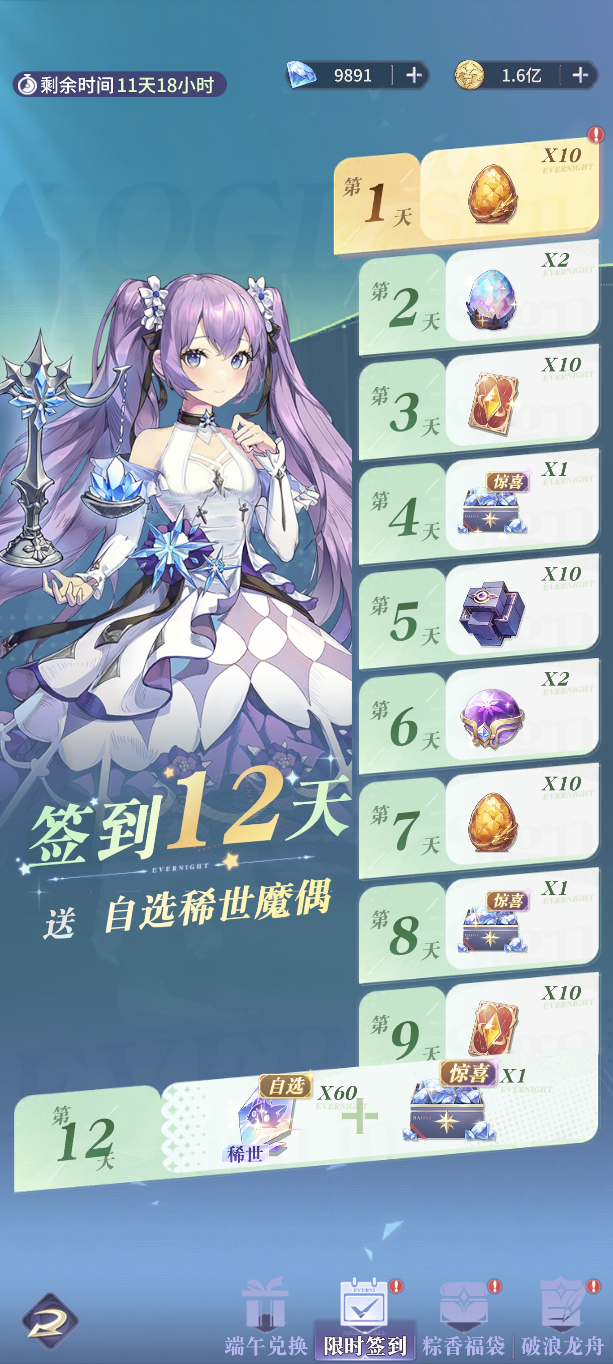 一、端午签到签到12天,可获得自选稀世魔偶、20连普抽、20连圣龙抽等奖励。