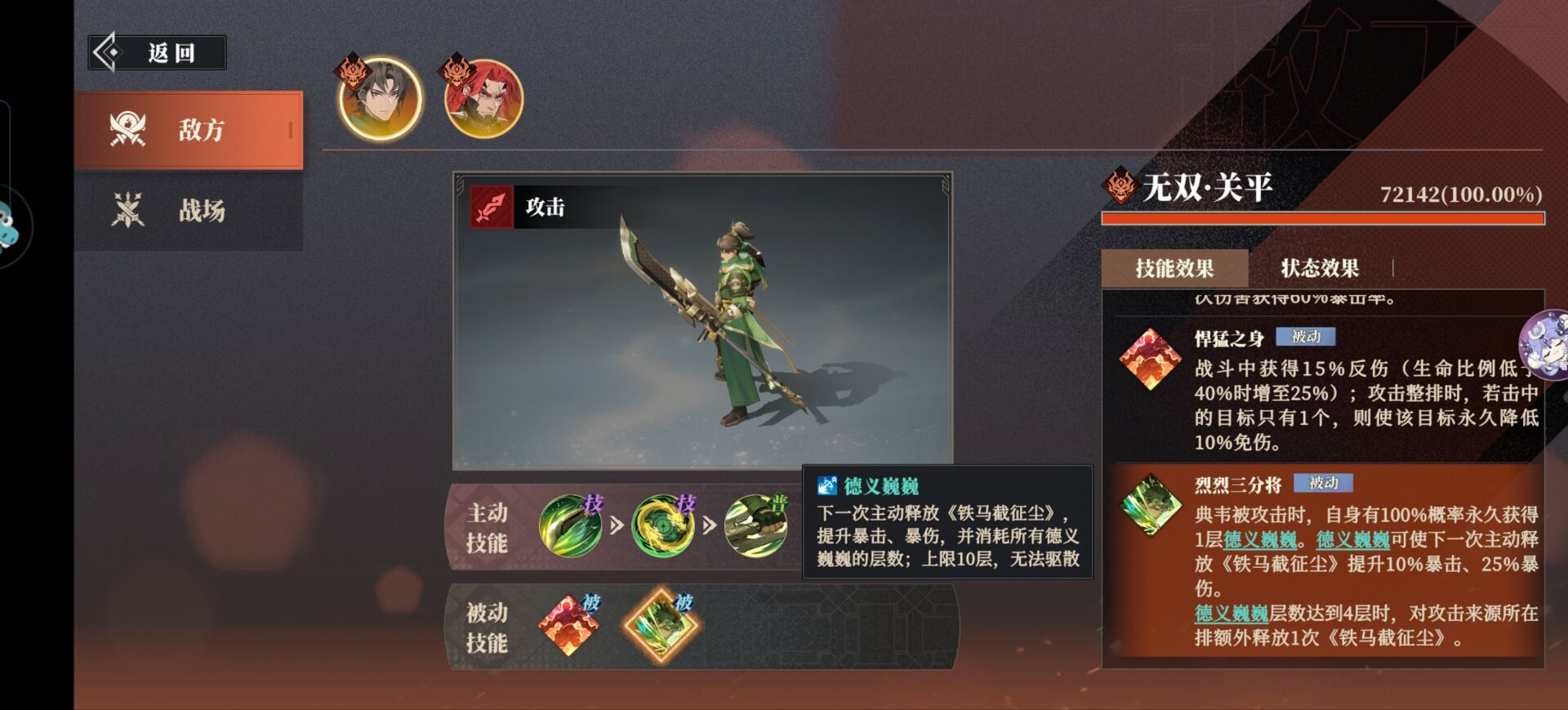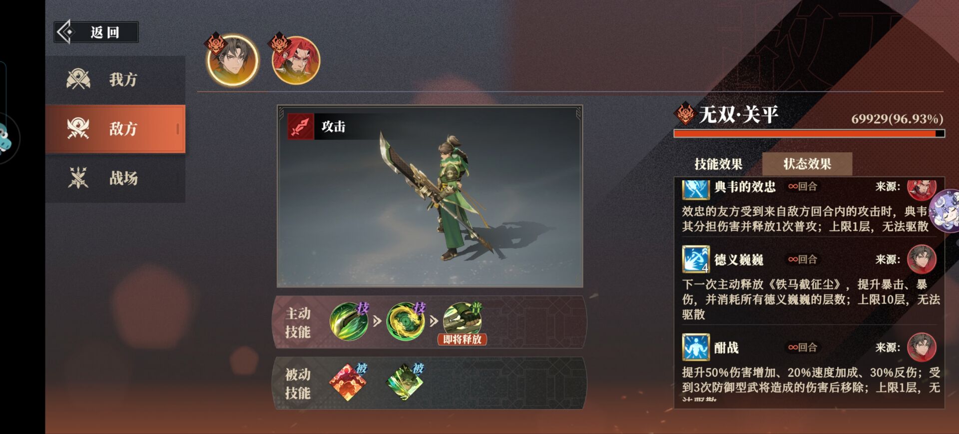 我们在攻击典韦的时候关平就可以获得一层:德义巍巍的buff。