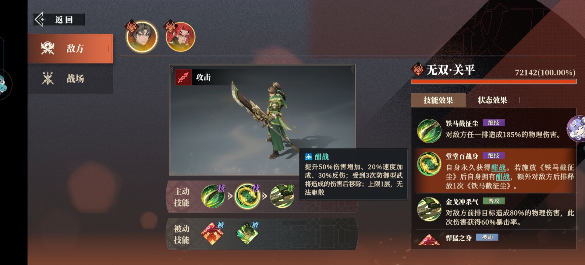 在配合上绝技50%增伤,对我们中后排威胁很大,我方后排很容易被关平秒杀!
