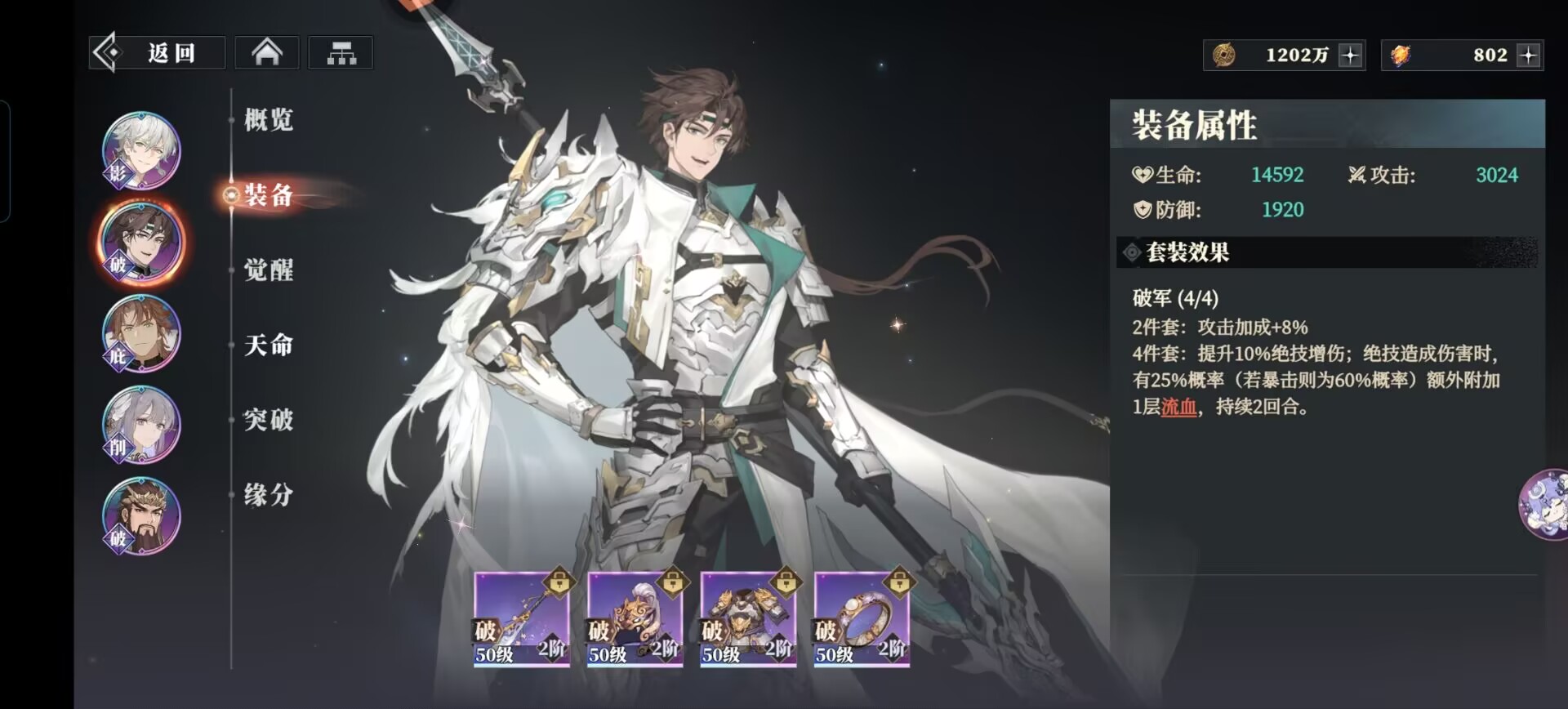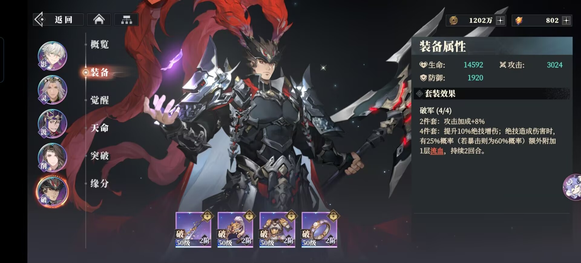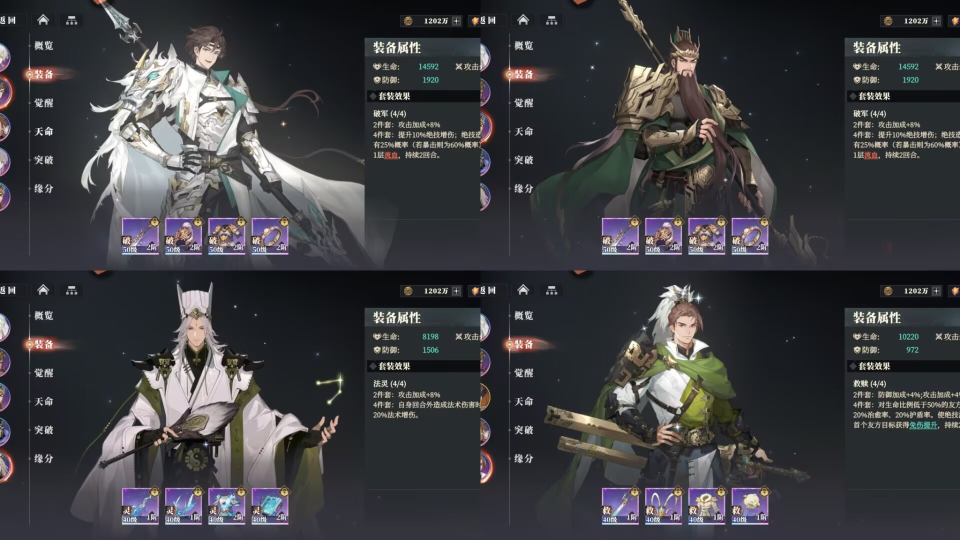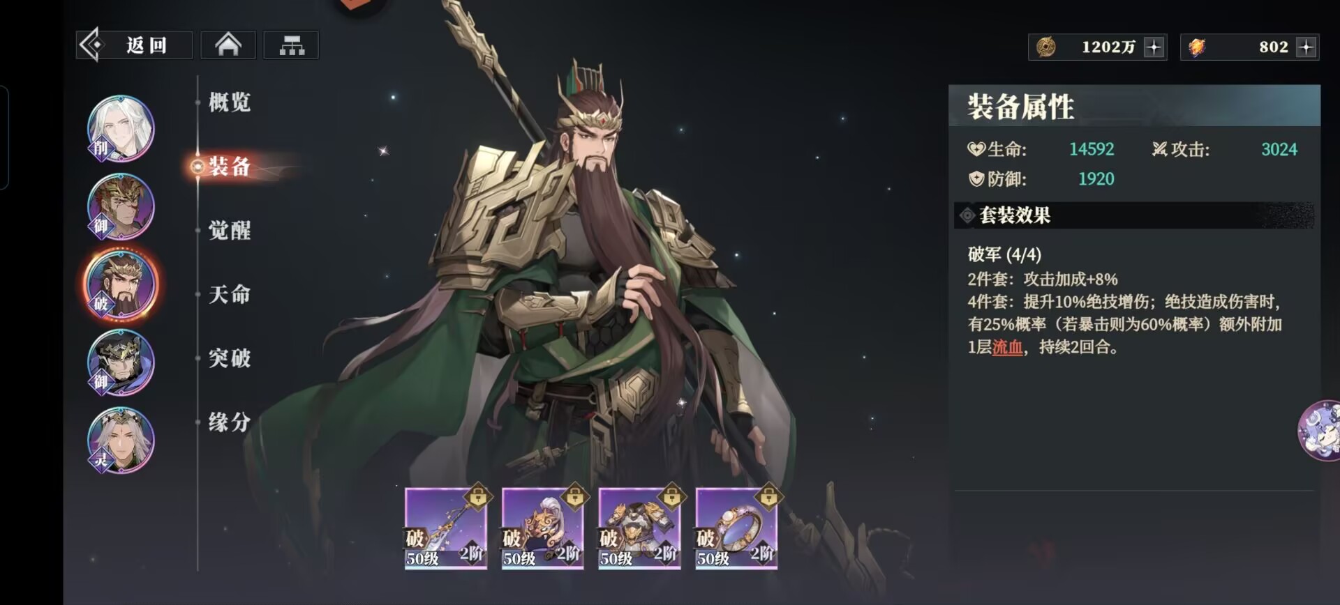 破军套:能够提升关羽攻击和绝技伤害,暴击后可以额外附加流血效果,很契合关羽高暴击的武将设定,能够极大发挥出这套装备的优势。
