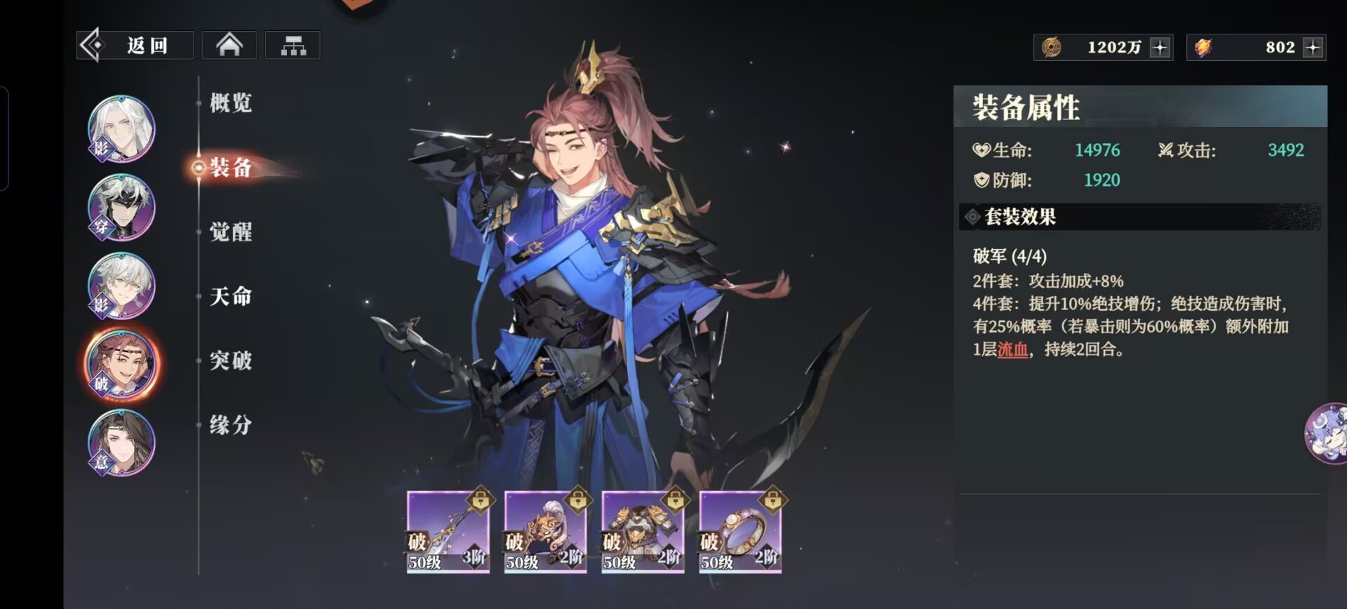 破军:提升攻击和绝技伤害,暴击后可以额外附加流血效果,和关羽一样,很契合赵云高暴击的设定,