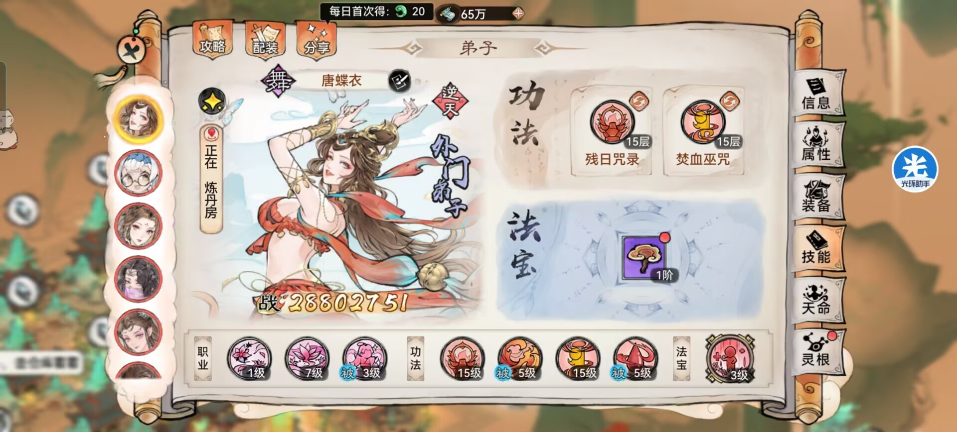 这里重点说的是唐蝶衣一定要推抵抗!抵抗越高越好!200%抵抗是最好的!避免被速攻阵容禁增或者是被控制等各类debuff!