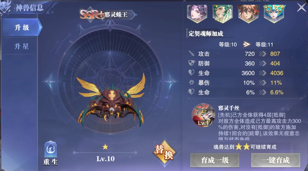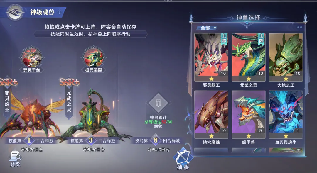 那么我们在获取到这些神兽后,便能够对其进行升级和升星,升级用的就是“圣灵丹”材料,而升星则是需要抽到同样一只神兽才能进行,当然目前已经开放的三个神兽上阵位是需要我们将神兽的总等级升到一定的门槛才能逐步解锁的,如果大家不买那个通行证的话,那截止到今天应该也是开不了第三只神兽位的。