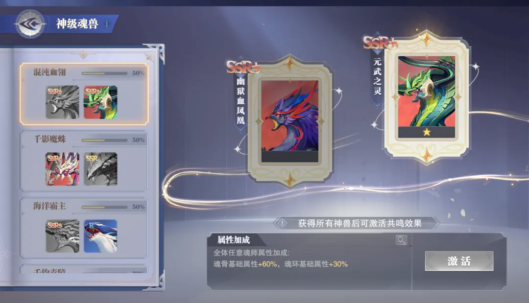 此外不同的神兽在激活后还有共鸣效果,这点有些类似于魂师之前的契合效果,而且每个不同的神兽还有定契魂师绑定关系,在激活后便能提升对应定契魂师的各项属性等。