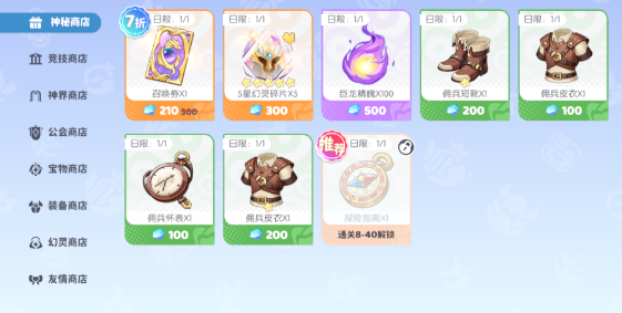 神秘商店每天会刷新一些可以用钻石/金币购买的资源道具,主要是装备、召唤券等提升战斗力的物品。