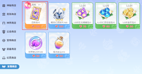 在友情商店中,推荐每周优先兑换一次召唤券,其余资源可根据队伍培养需求,选择补充当前缺少的道具。