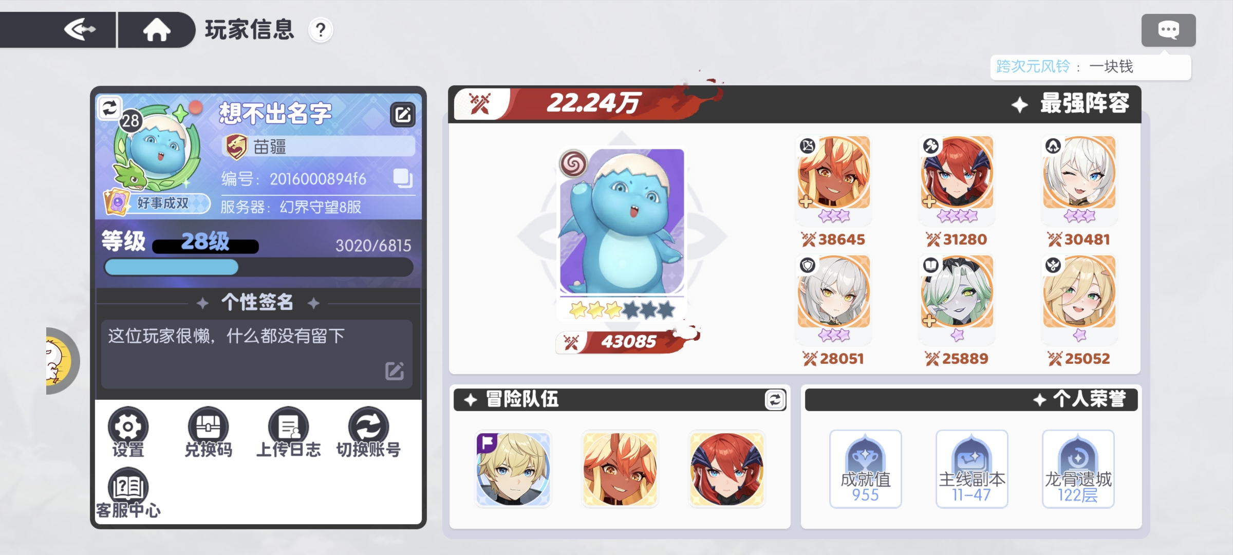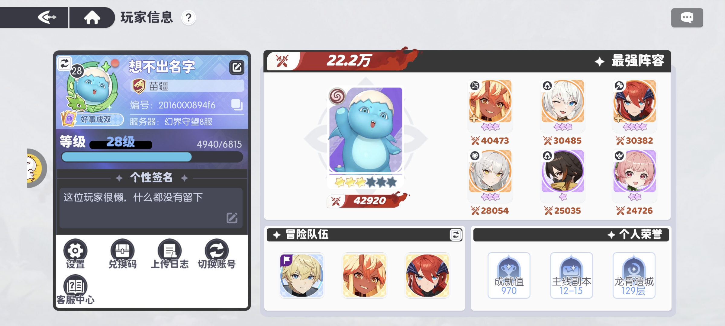 第三天总战力22万+,主将战力4万+,主线副本12-15(第三天极限12-16,下午看看领取挂机经验能不能通关12-16)龙骨迷城129层