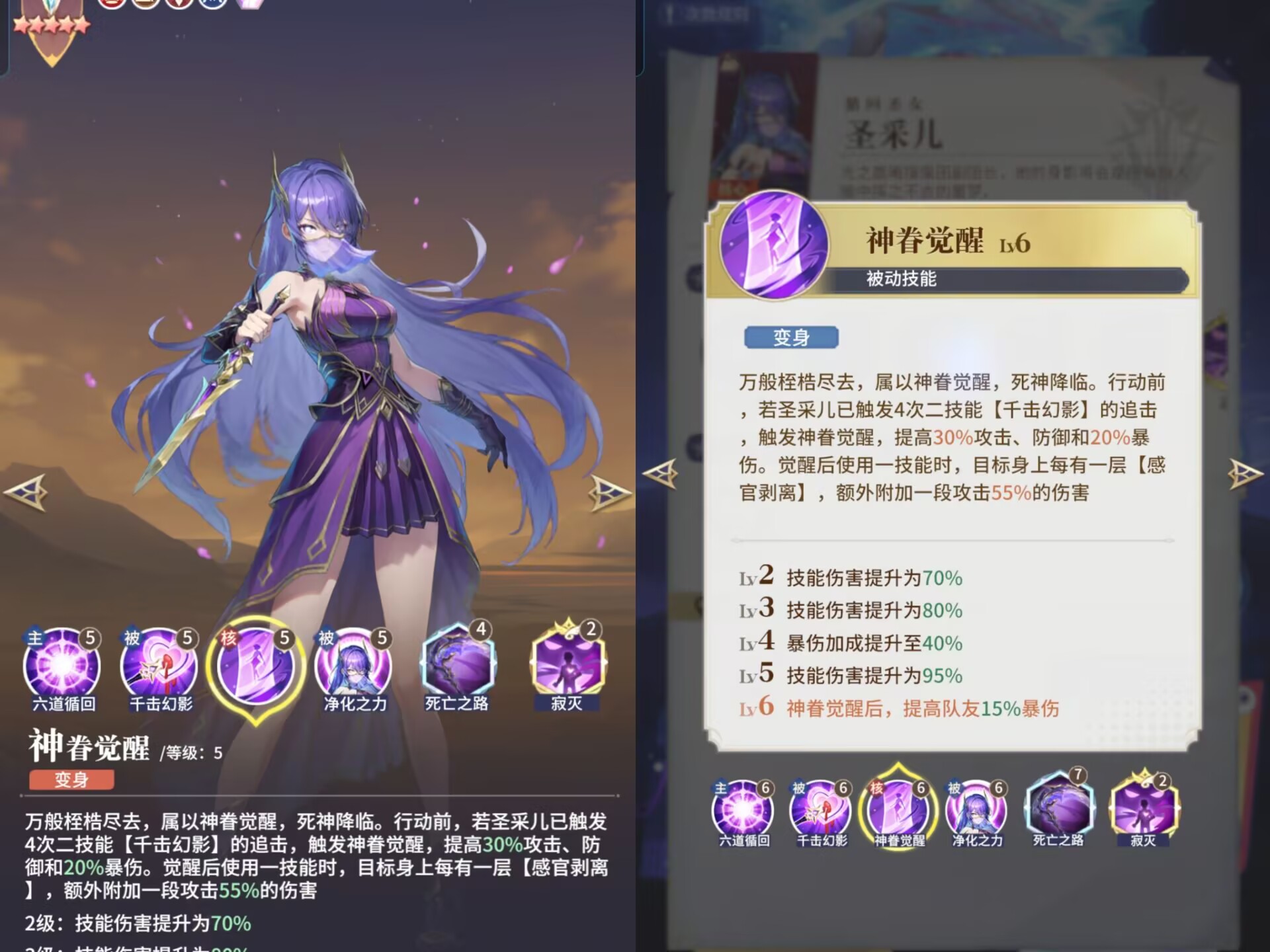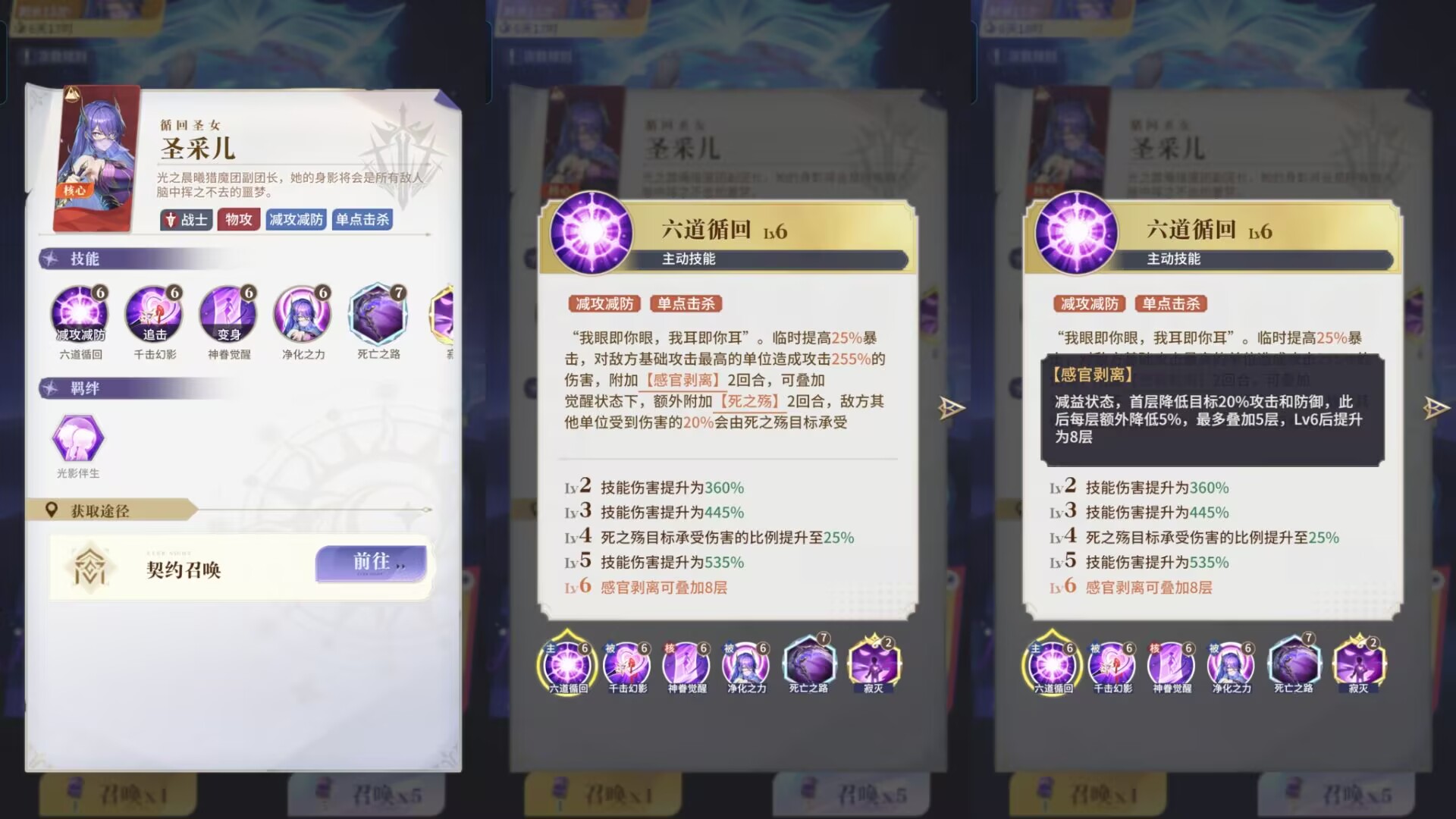 4星:是质变只要有敌人被控制【感官剥离】的目标也有几率被控制,配合群控角色有很大的优势,比如莎菲尔、斯黛拉。