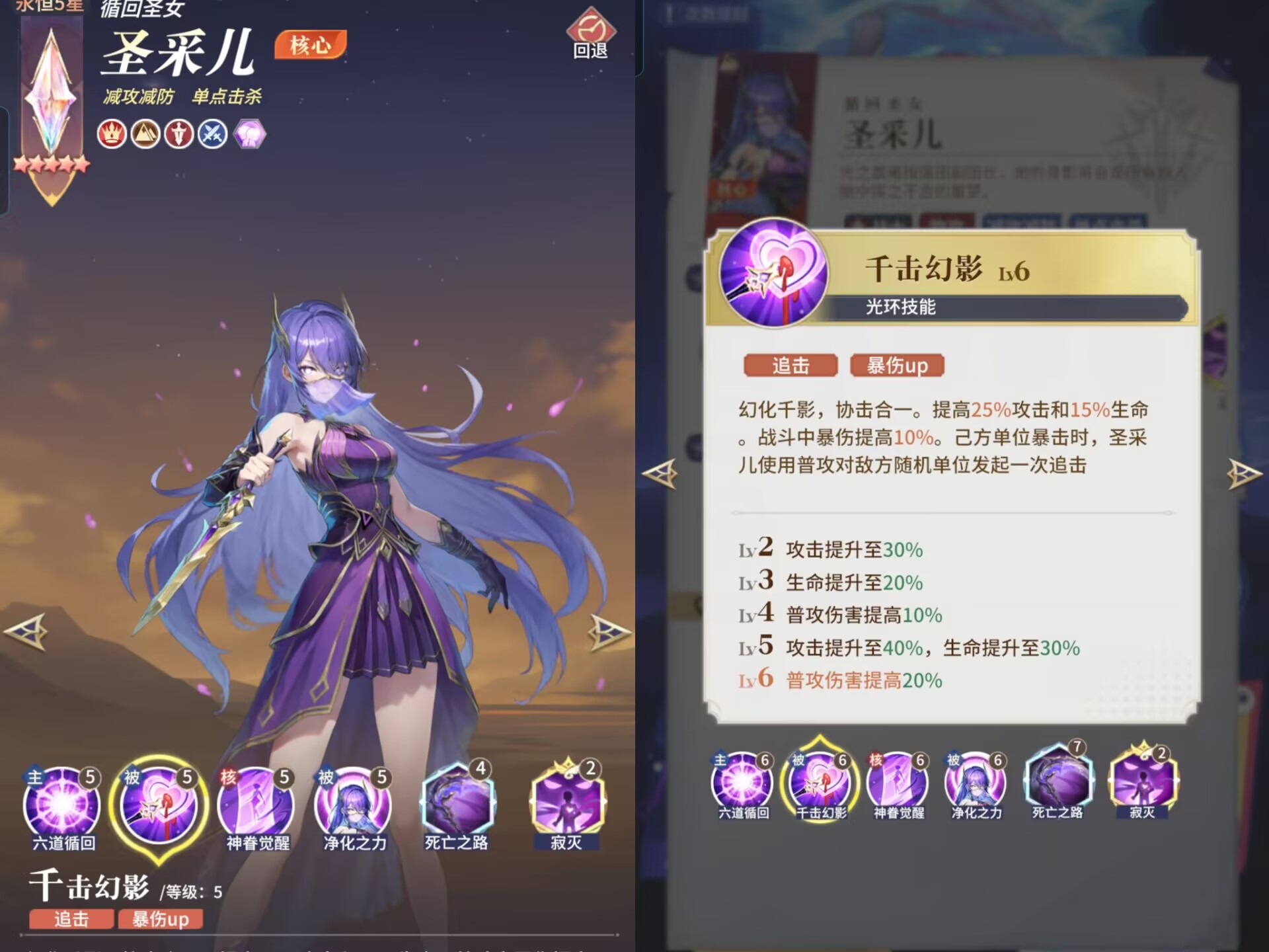 二技能主要在于可以提升:普攻伤害,同时提升自身10%的爆伤,并且我方任何的队友只要暴击,圣采儿就会用普攻追击敌方的任意单一。