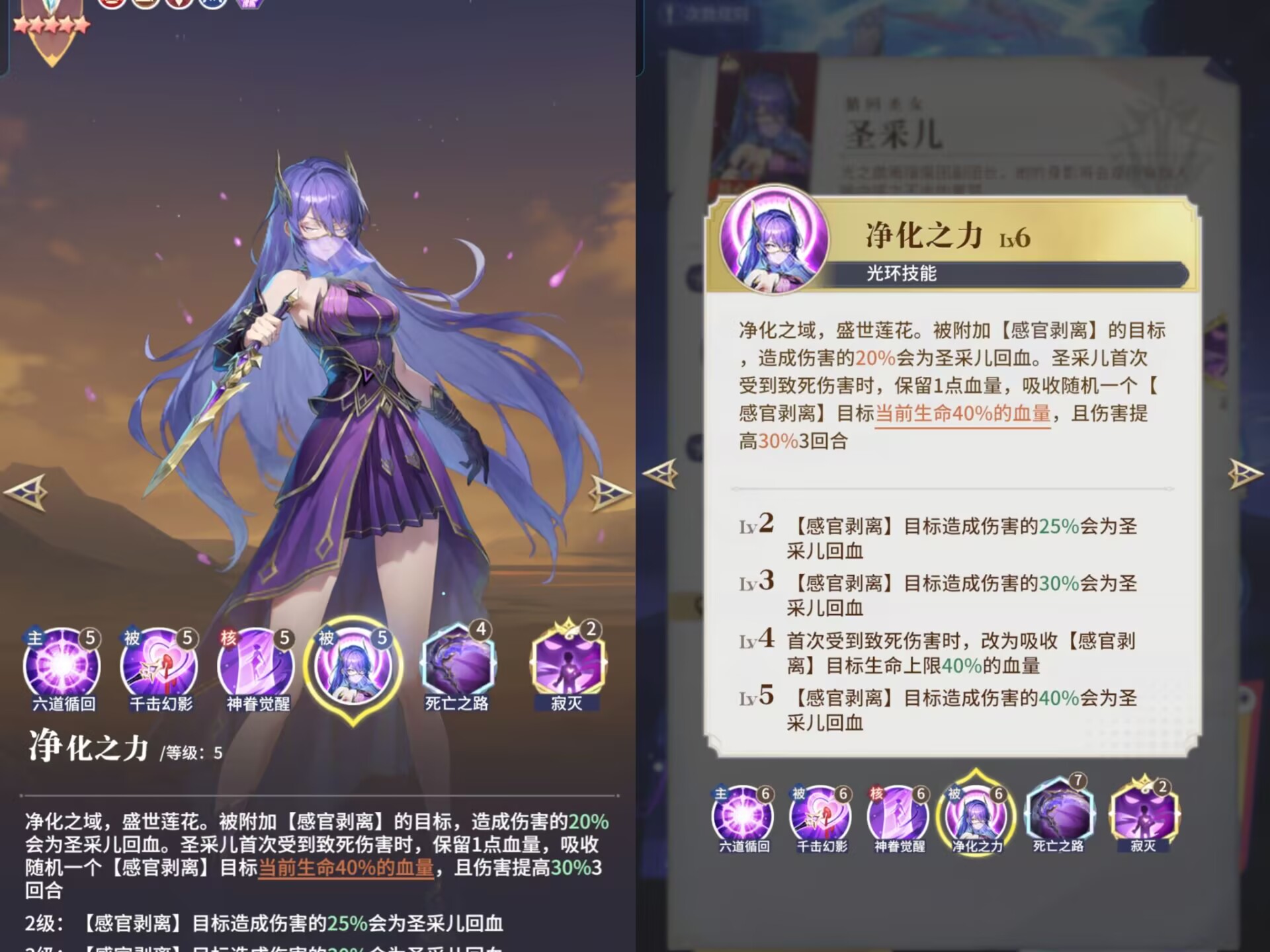 ②圣采儿受到致命伤害,会触发保命,同时吸收【感官剥离】目标的当前40%生命给自身。同时加强30%伤害。