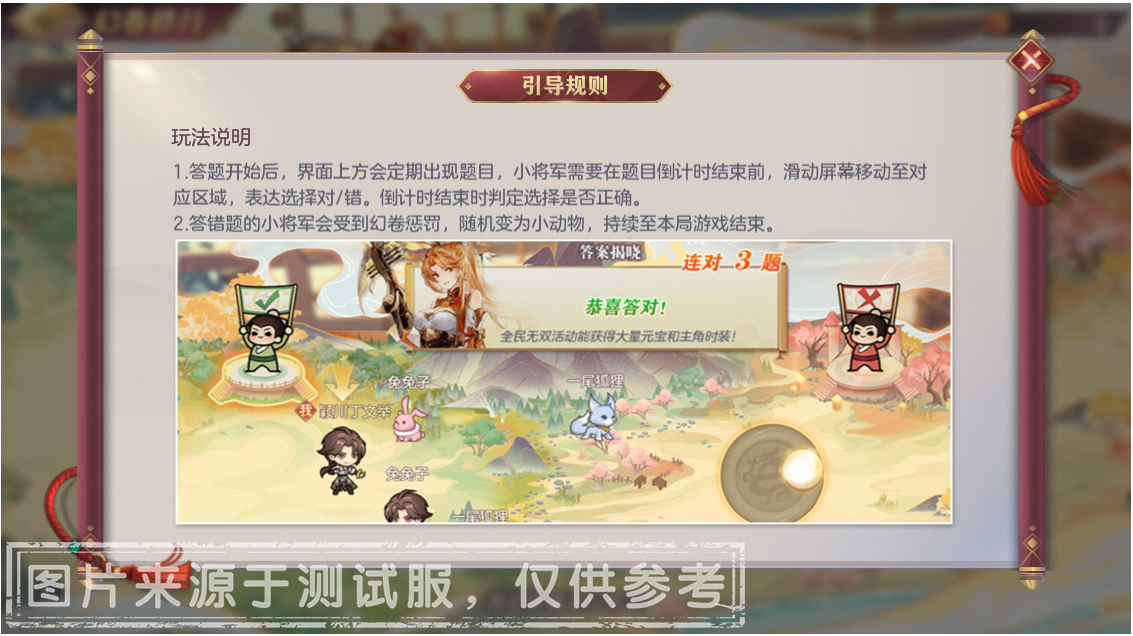 倒计时结束后将公布题目答案,答对的小将军将获得「幻卷学分」,答错的小将军会随机变成小动物哟~小将军累计足够的「幻卷学分」将可以领取「元宝」、「1星普通橙色幻武任选」等奖励。