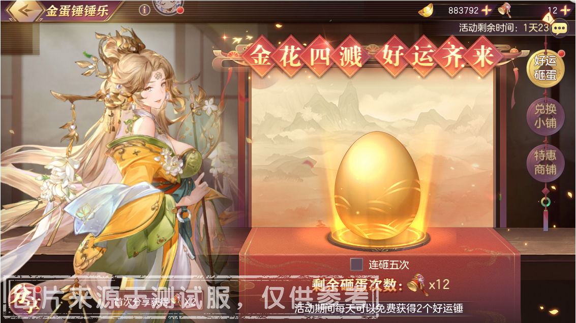 砸蛋高级礼包:包含元宝*980,「好运锤」*20,售价98元,活动期间限购3次。