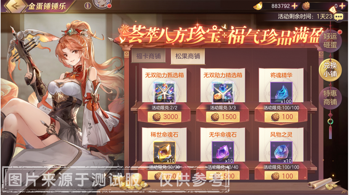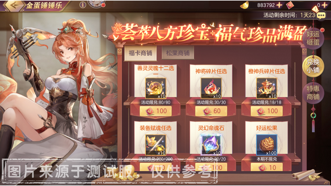 荟萃八方珍宝,福气珍品满盈!小将军可消耗固定数量的「好运福卡」、「好运松果」在兑换小铺中兑换「善灵灵魄十二选一」、「神将碎片任选」、「灵幻命魂石」、「无双助力甄选箱」等珍稀资源!。
