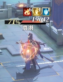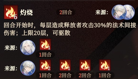 实际的战斗界面我们看到,贾诩头上是6层火,但这6层火实际分为了5种:周瑜挂的1回合火、陆逊普攻及绝技挂的2回合火、1火陆逊被动挂的3回合火、陆逊天赋复制的普攻绝技2回合火,以及陆逊天赋复制的被动3回合火(图标中层数不对应,是因为已经过了1回合造成伤害并消耗了回合数)。