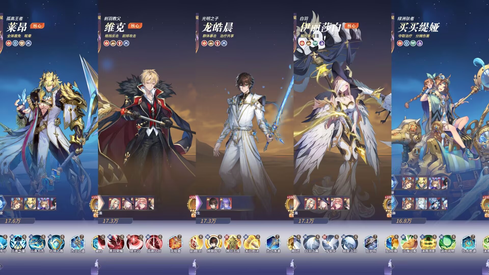 莱昂+买买缇娜:给队伍提供强力的生存续航净化效果,维克+龙皓晨两者暴力切前排,伊丽莎白解控和复活。