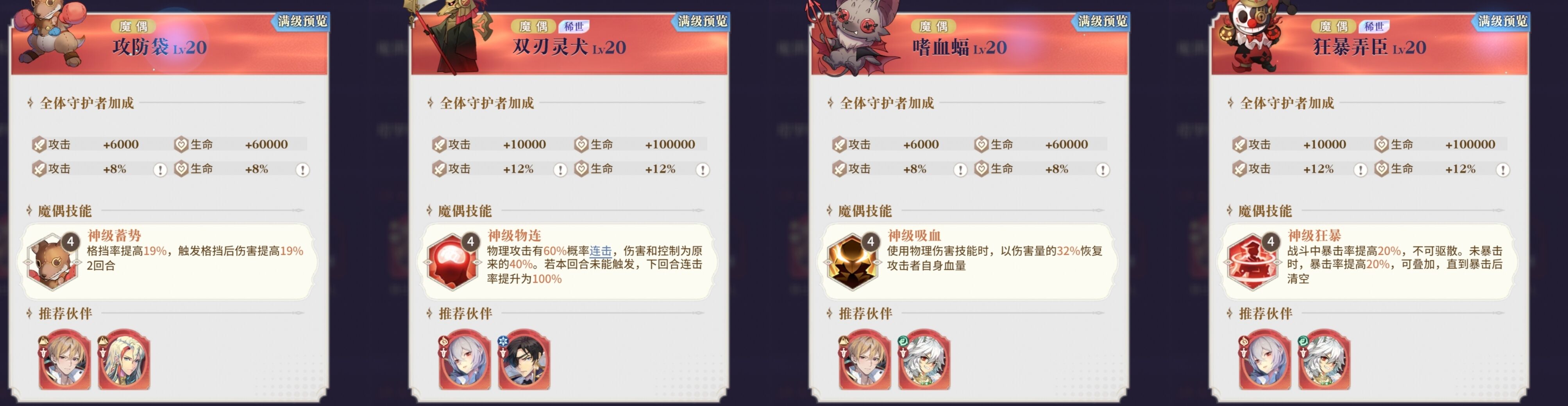 1:魔偶推荐:物连+蓄势+吸血+狂暴。