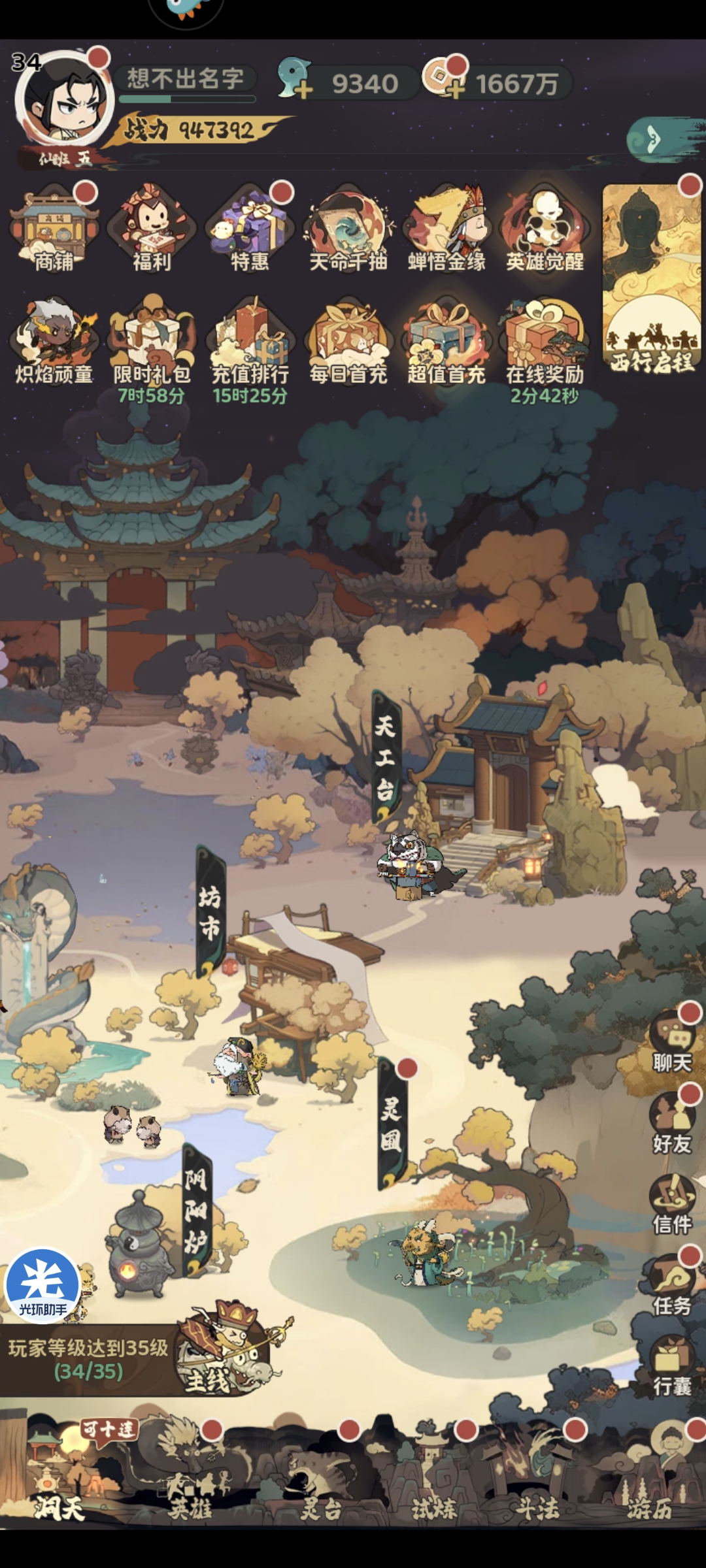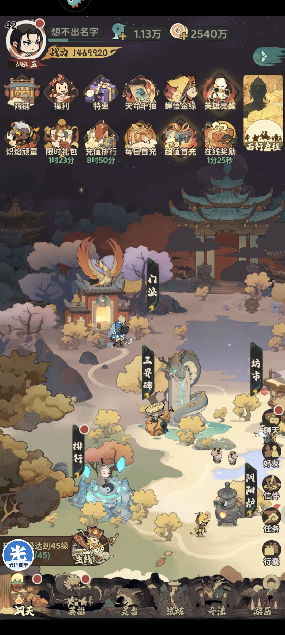 第二天登录领取挂机经验完成快速扫荡(截止下午三点)等级可以达到42级,主线副本可以通关第十七章,开启玩法万妖巢