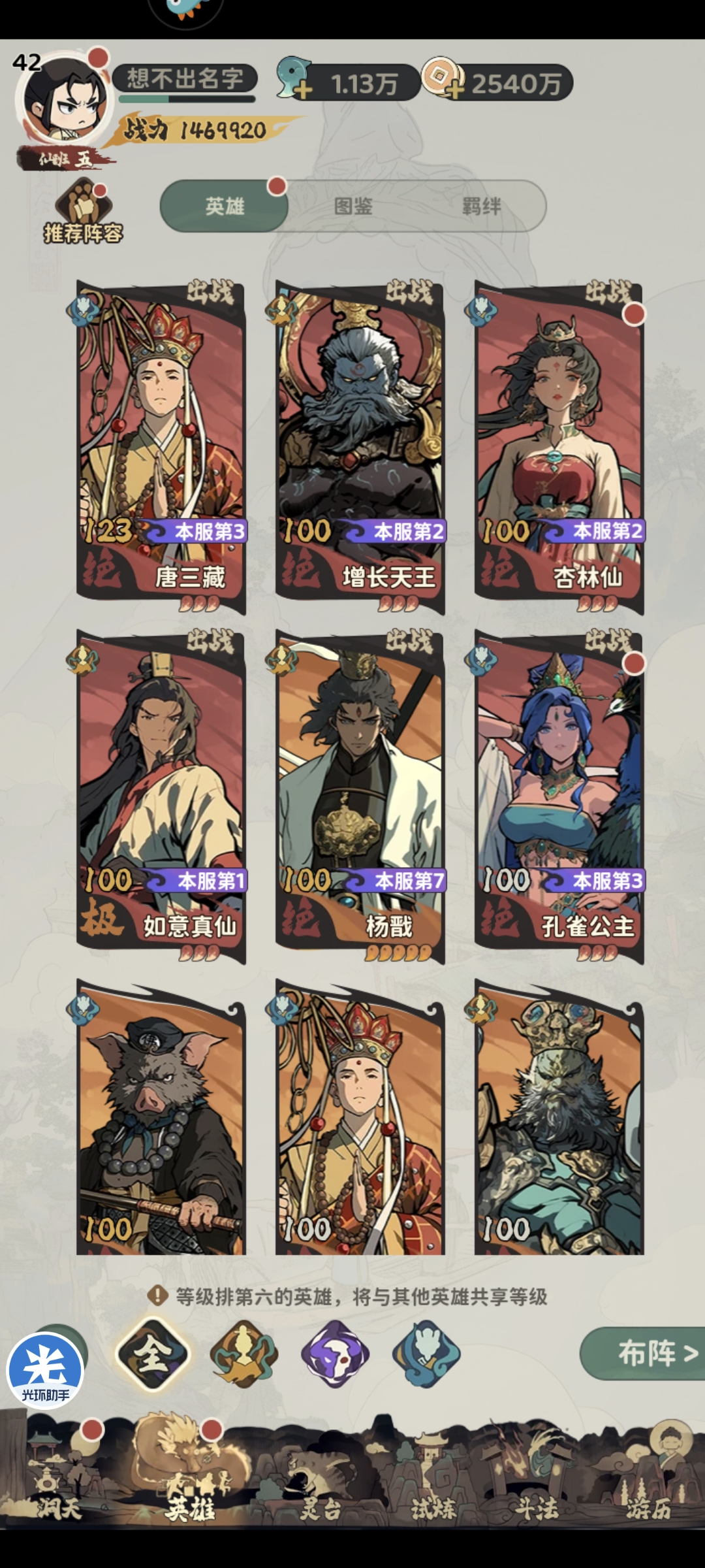 第二天等级42级(截止下午三点)总战力146万,主线通关第十七章,浮沉塔174层,骨冢闯关9-9,钻石剩余1.1万,第二天将有两个本体的英雄升至八星,前期阵容不易成型,上阵星高的即可