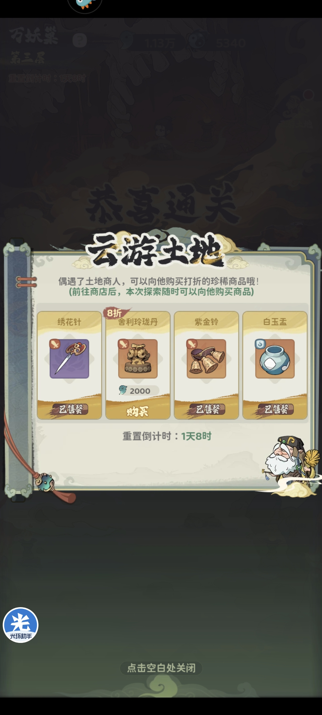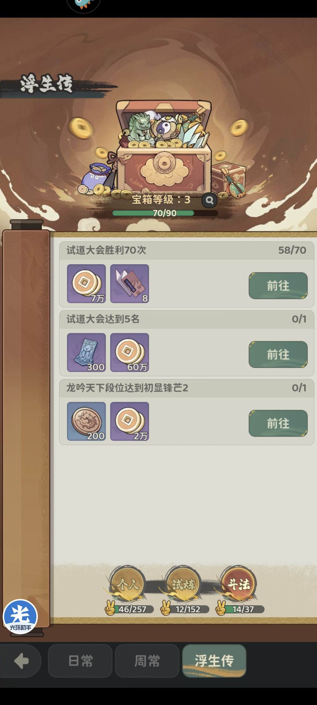 选择通关玩法,每次击败小怪可以获取增益,通关三层即可通关,如果自身阵容血量健康推荐优先选择小关和头目路线,每次胜利可以获取阴阳石,第三层优先选择云游土地路线,商店2000云游石可以兑换一个橙色法宝,前期性价比较高,兑换2个橙色法宝开启图鉴佩戴可以有近10万战力提升,开法宝图鉴后可以攒阴阳石在万妖商店兑换亢金星君(阴阳币每次通关大概给4000-5000,赌阴阳石全赌对极限在6000,如果是周三前建号可以保证第一周有两轮万妖巢挑战,2次通关奖励+任务奖励阴阳石可以攒够15000阴阳石,长期来看兑换亢金星君性价比更高,否则兑换橙色法宝保证第一周优势即可)