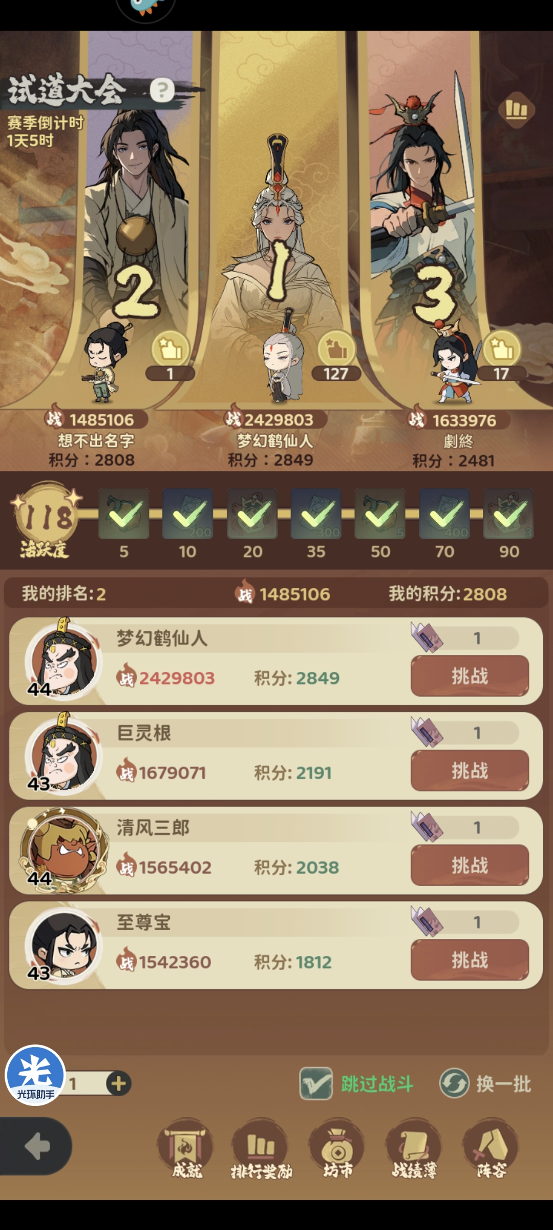 第二天竞技场可以开始刷分达成成就2800分领取大量升星狗粮,具体操作如下,首先在坊市随机商店刷新购买折扣竞技场挑战券,顺手购买五折三界召唤令、奇遇刷新券以及铜币购买的突破石,尽量在极限战力145万+再去挑战,观察整体积分排名第一名是否达到2800分(如果未到建议第三天刷)以及前四名是否有1-2个常胜对手,每次挑战常胜对手即可分差不大每次至少增加10分最多20分,竞技场挑战券用完可以在任务浮生传领胜场奖励,如果全胜场基本上消耗100挑战券即可达成2800分,领取红孩儿和1800卓越碎片