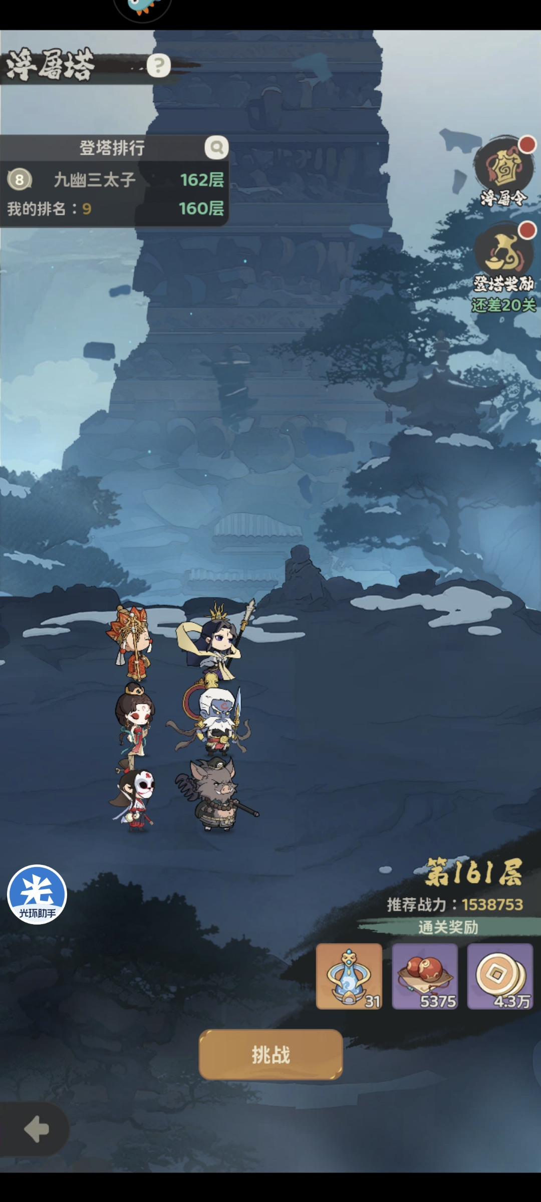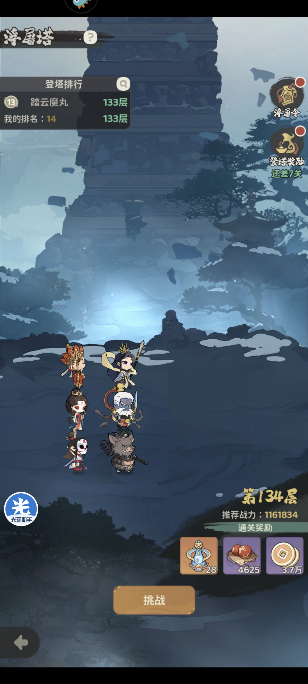 战力提升至110万+后进行浮屠塔挑战可以达到130层,领取爬塔奖励并进行藏宝秘境扫荡,对伙伴等级进行提升,全部提升至100级主将提升至120级,同时抽卡将主要武将升至8星,战力提升至130万+,再次爬楼可以通关160层