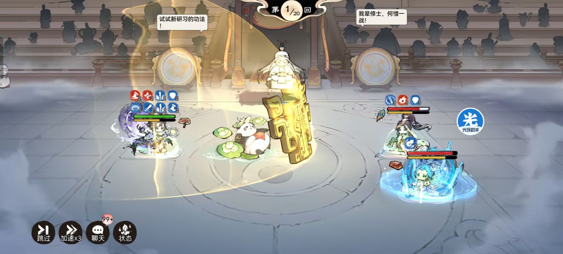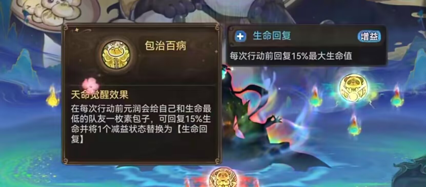 元润每次行动前都会给自己和生命最低的队友一个包子,可回复15%生命并加1个减益转化为生命回复。