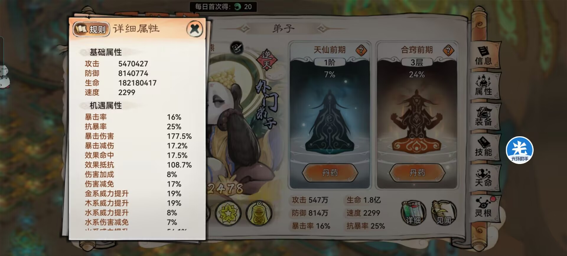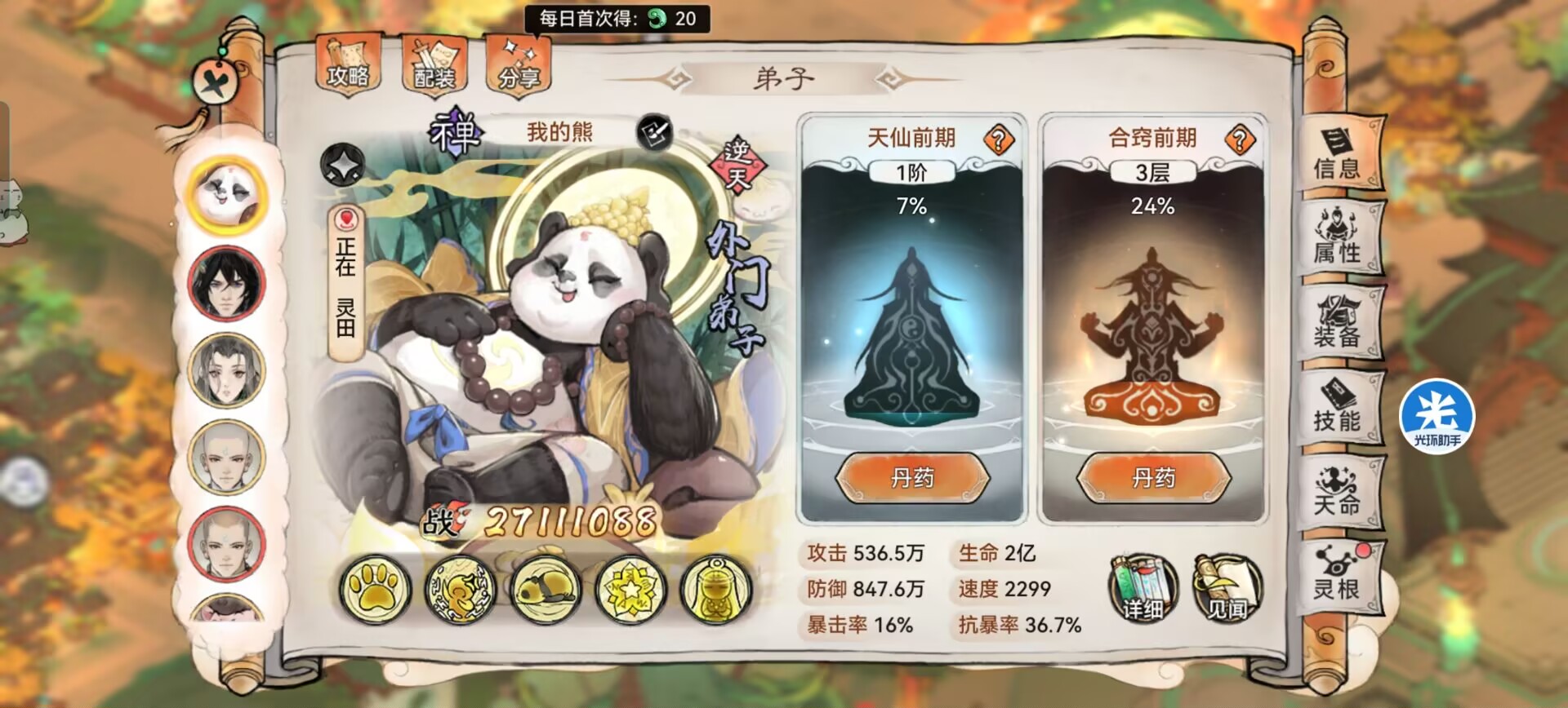 元润各位祖师相信都不会陌生了,是我们前期阶段的主力弟子之一,虽然不是仙缘弟子,但是熊猫一样的外貌也是非常吸引人的!
