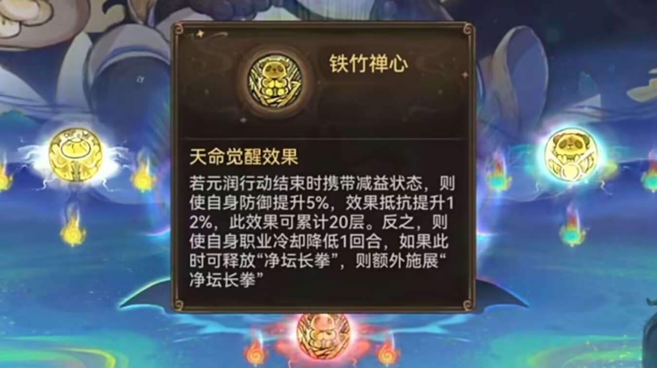 ①元润身上只要有减益buff包括燃烧、中毒这些都算减益buff,每回合行动结束就可以提升自身5%的防御和12%的效果抵抗。