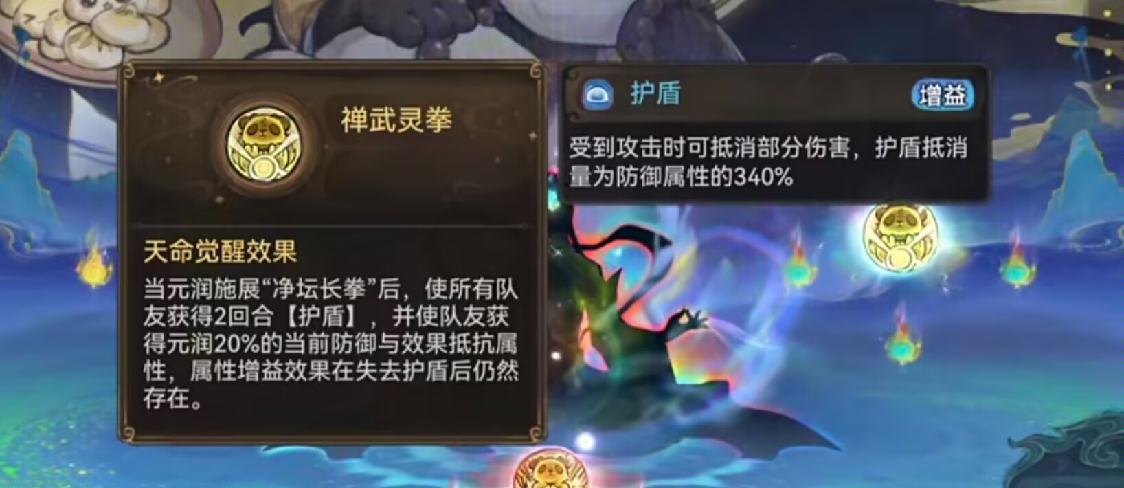 ①元润施展【净坛长拳】以后,使所有队友获得2回合的340%防御护盾。
