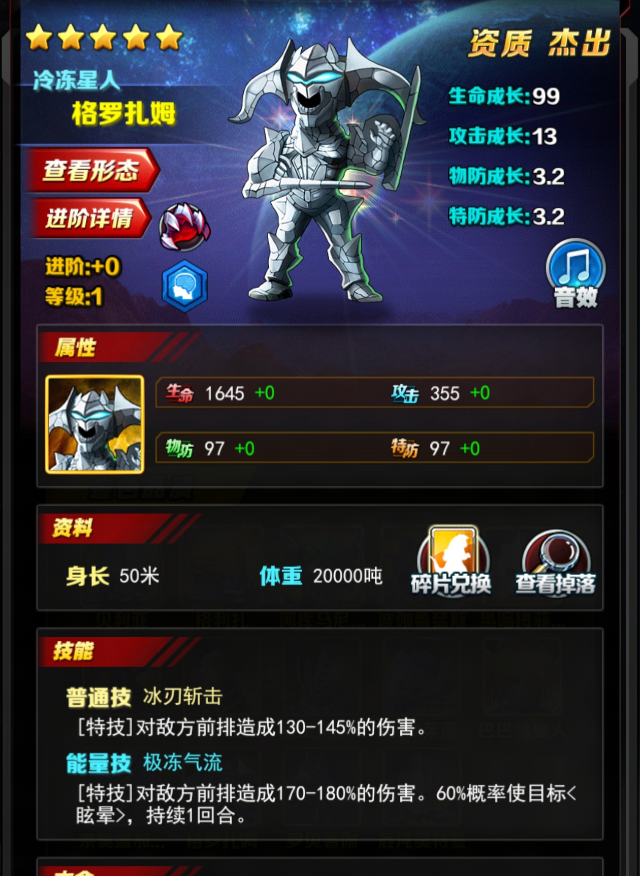 -资质与成长:杰出资质,生命成长99(初始生命1645),攻击成长13(初始攻击355),物防与特防成长均为3.2(初始双防97)