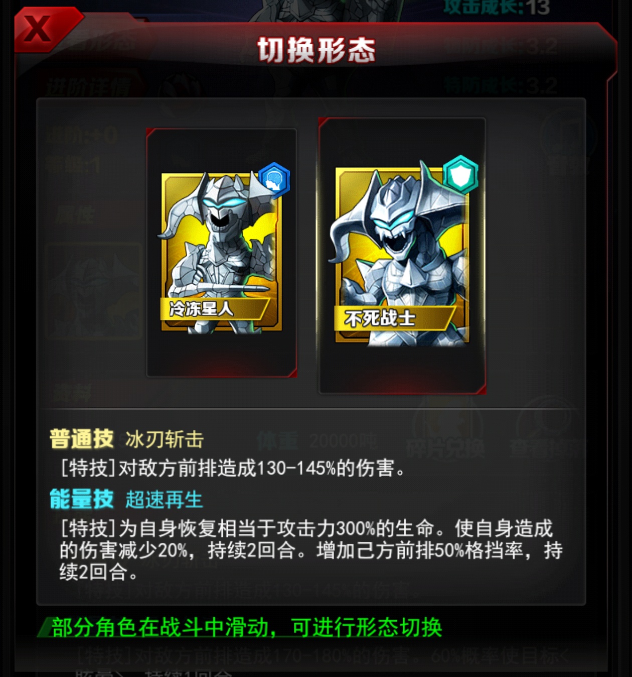 3. 形态切换:进阶+3后解锁,可灵活调整攻防策略(如防御形态堆叠免伤,输出形态强化技能伤害)。