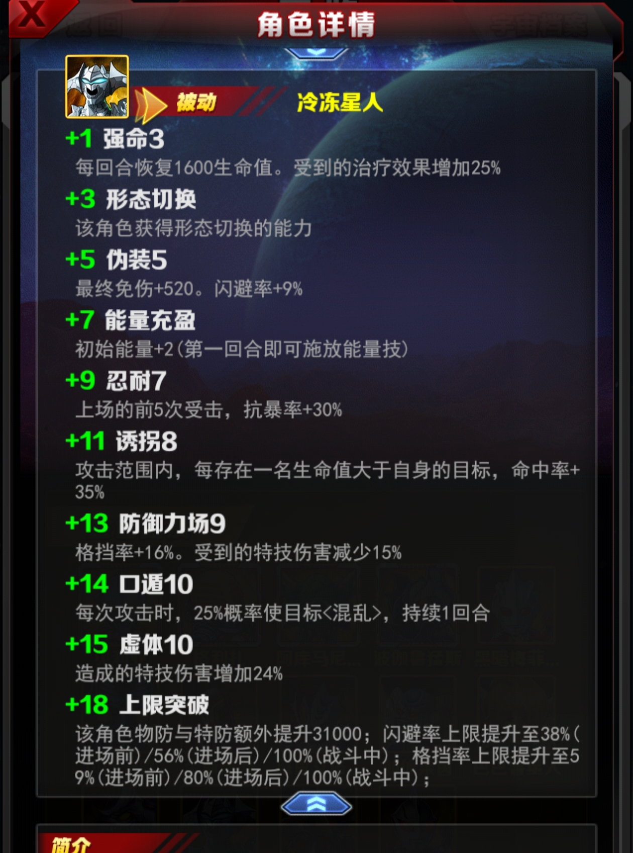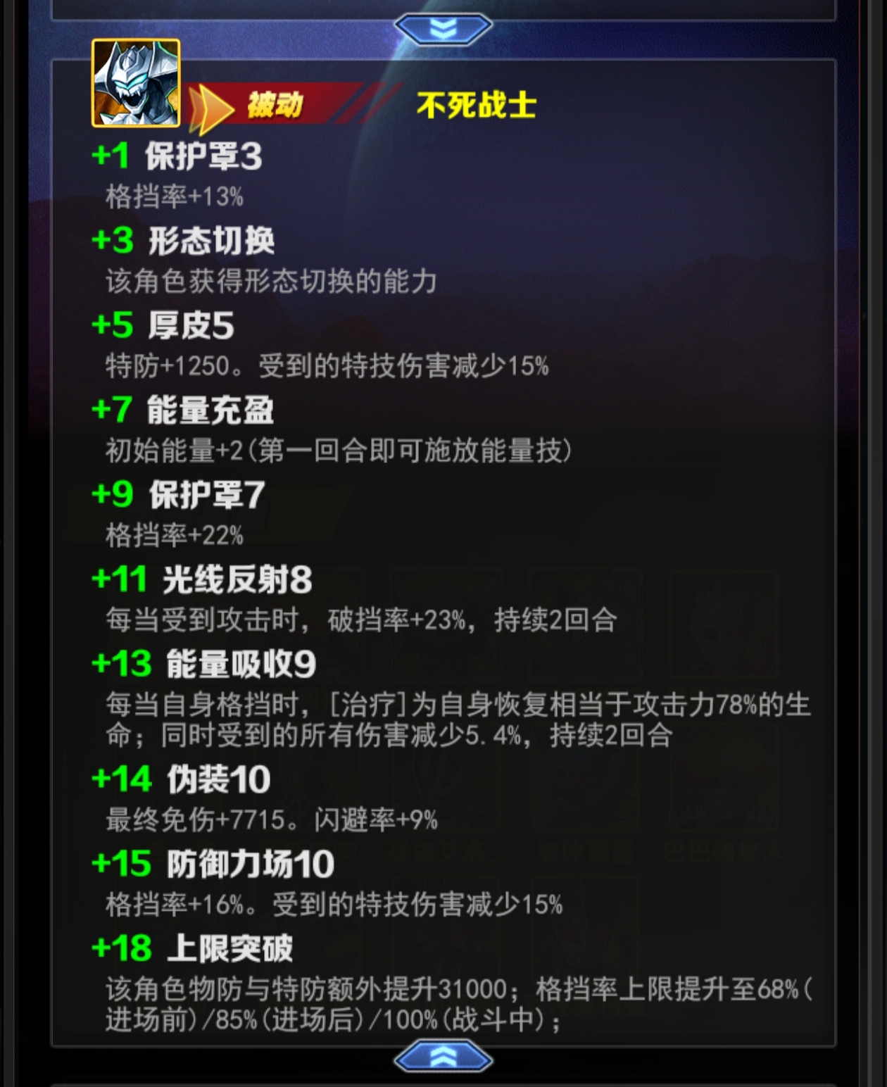 - 极限防御:进场后闪避率56%,战斗中格挡率100%,近乎无敌的前排。