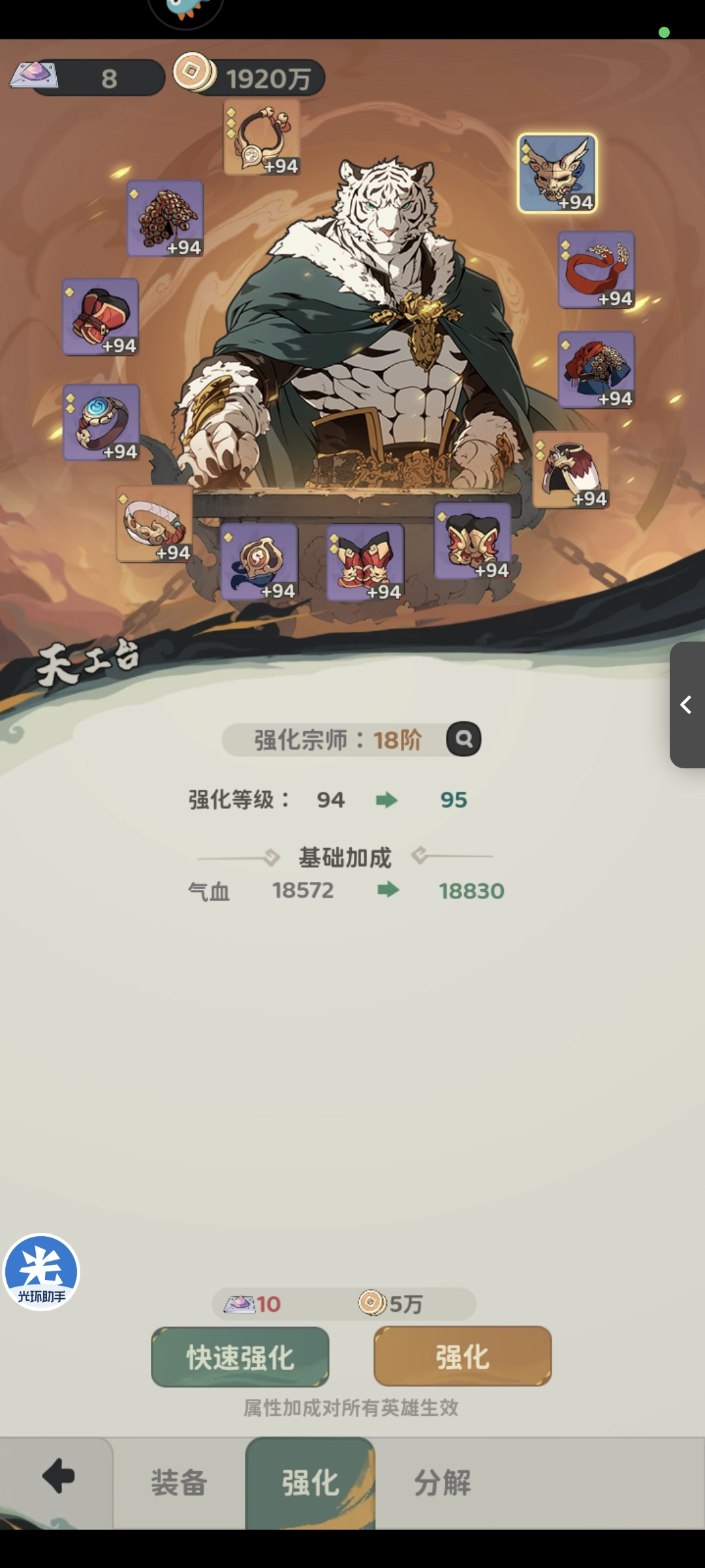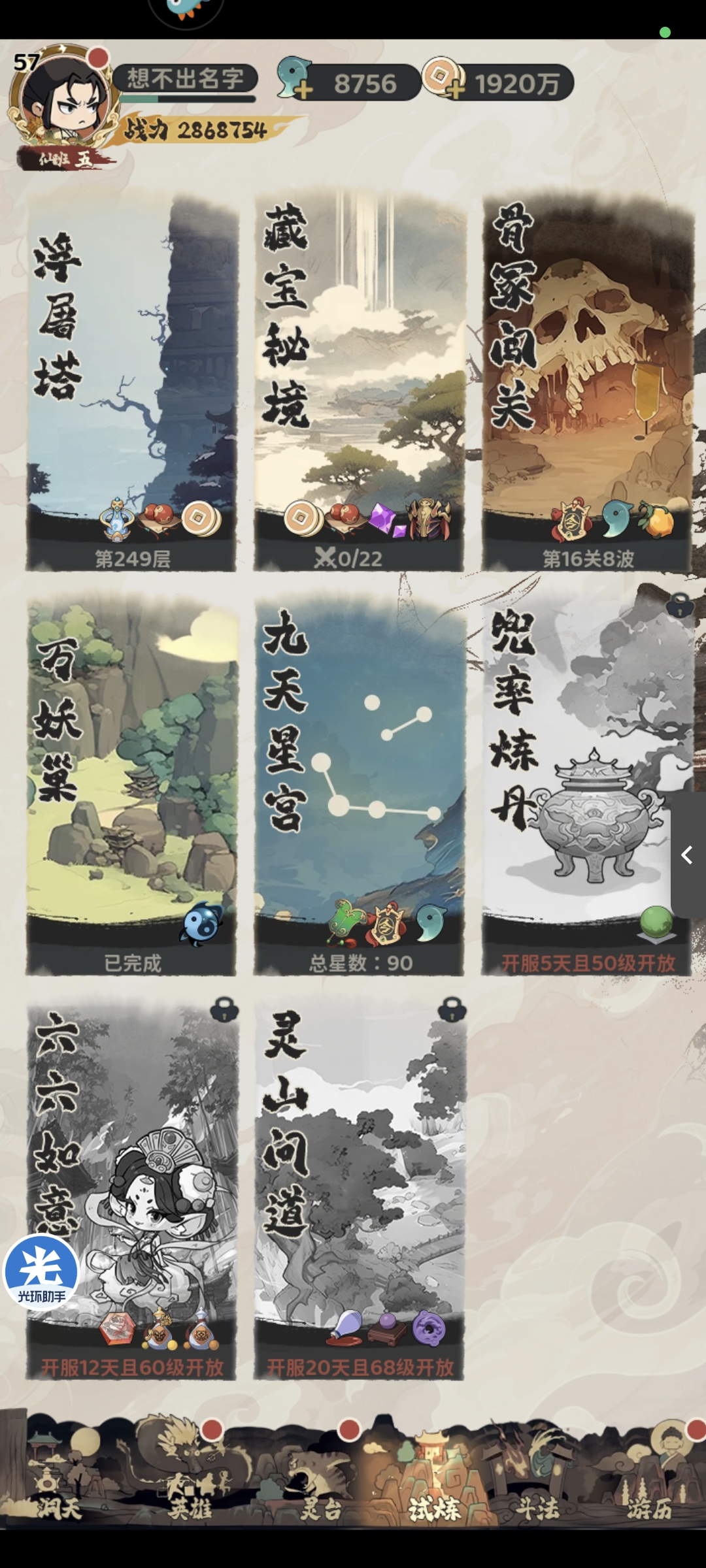 随后挑战试炼-藏宝秘境和试炼-万妖巢玩法,获取大量装备和法器,开启法器图鉴和共鸣,穿戴法器并且更换装备分解装备强化装备,战力提升至250万+