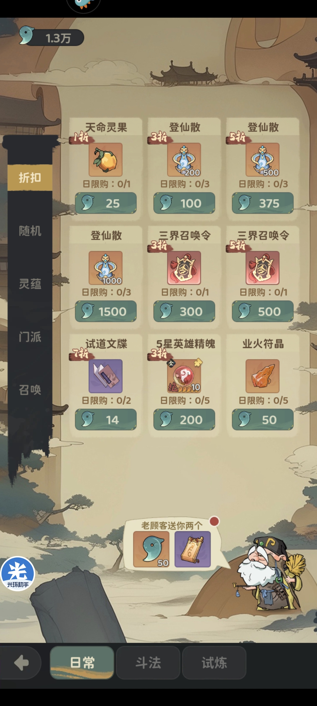 推荐每日购买天命灵果+3折/5折登仙散+3折/5折三界召唤令+试道文牒