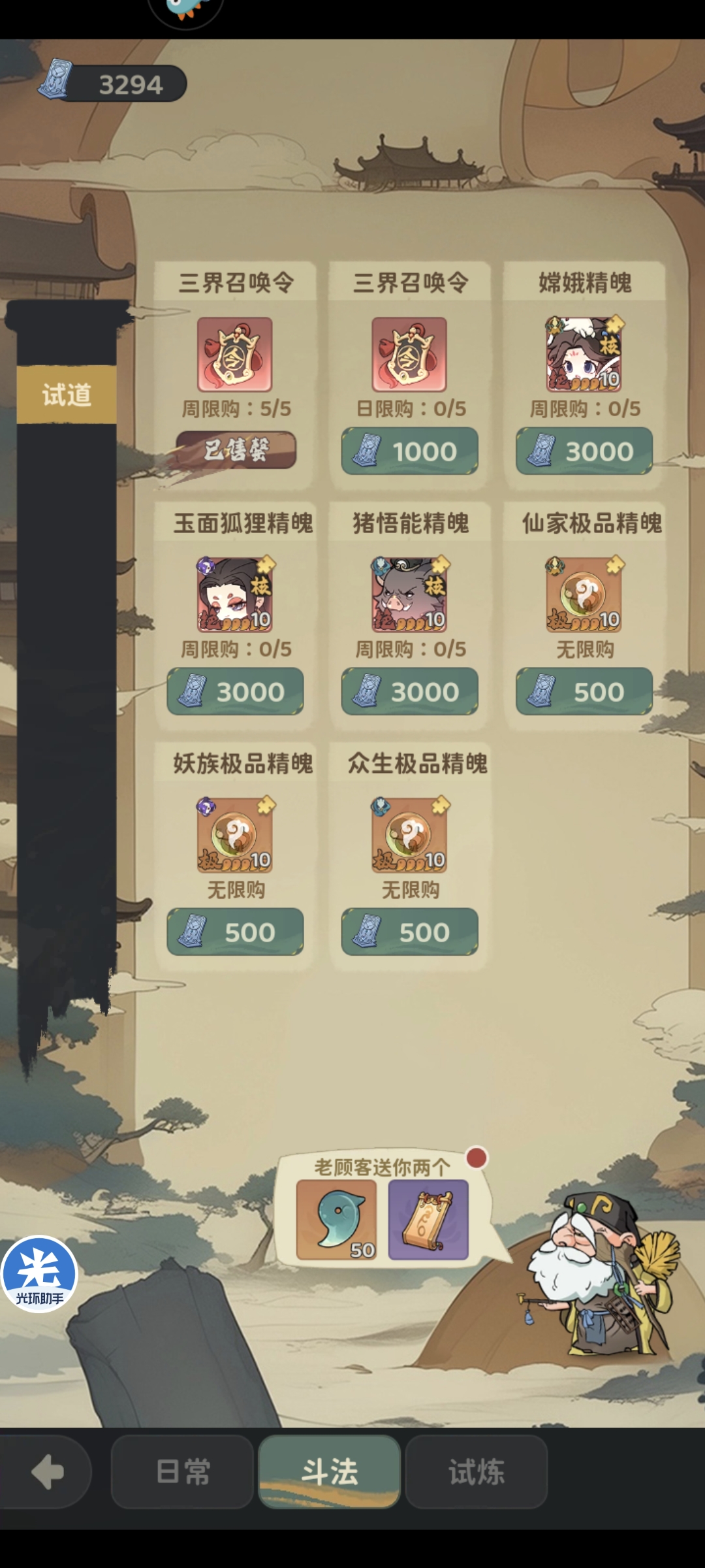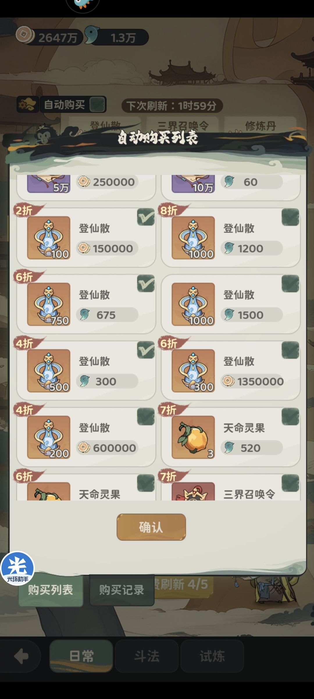 登仙散和三界召唤令同日常商店,6折登仙散看需购买5000以上可以咱不购买,奇遇刷新券全部购买,奇遇刷新总会不够的,试道文牒保证每周90完成竞技场挑战任务即可