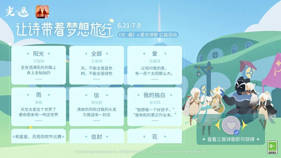 纸上星光 爱满云端|《光·遇》绘梦节运营活动公告是泽哦发布于 06-20关注《光·遇》x 是光诗歌公益活动现已启程前往活动页面即可了解活动详情📖6月21日~7月9日在活动页面查看任意三首诗歌,可获得爱心*1活动期间,青衫落拓礼包将在商店限时发售💝与《光·遇》一起用诗歌传递温暖让每一份善意都化作照亮世界的光芒吧2025年6月20日《光·遇》官方运营团队