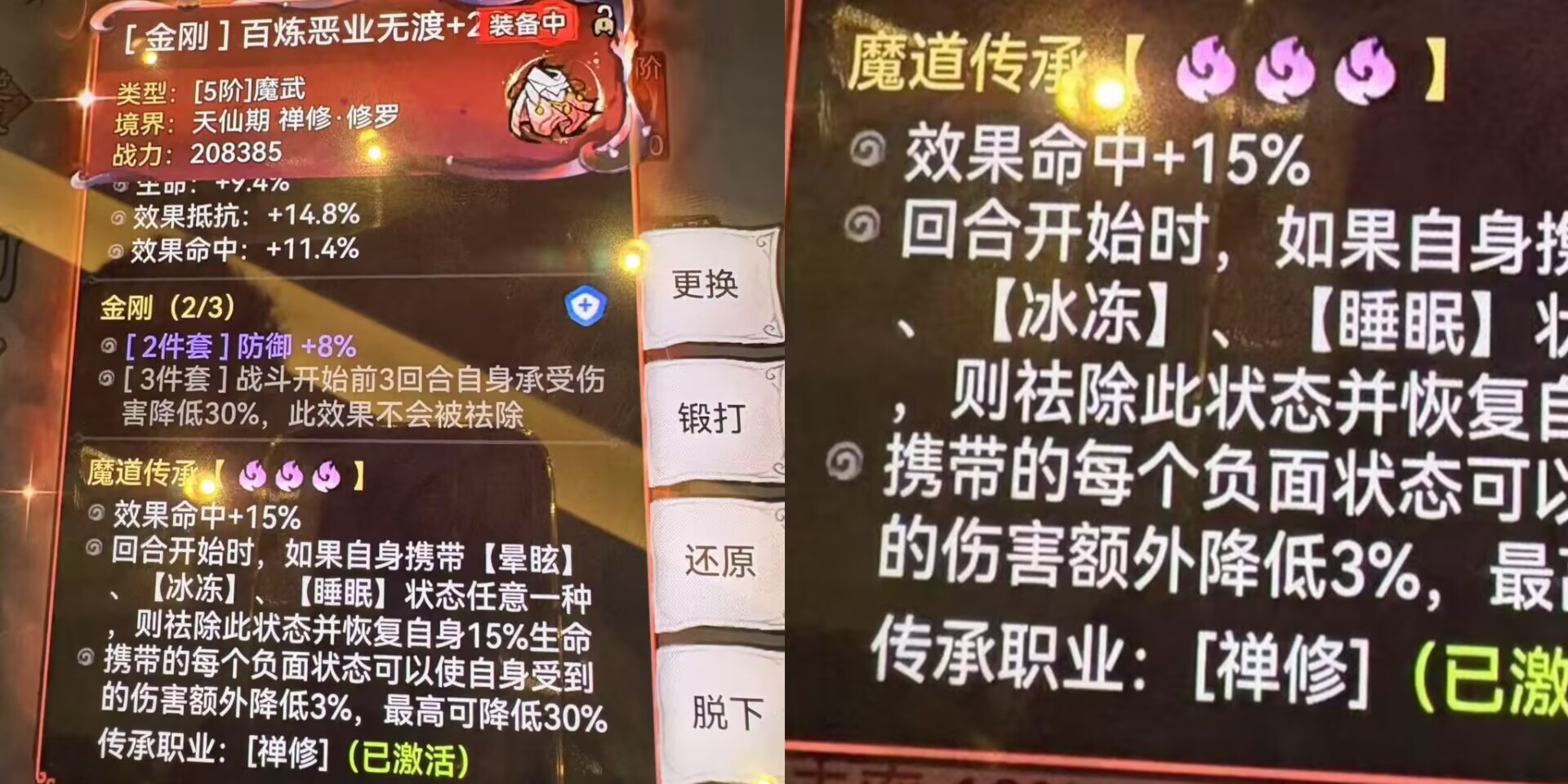 凝练三阶:减少魔禅受到的伤害,提升生存,很符合魔禅的设定,负面越多,降低的伤害就越高。因为魔禅是可以把队友的负面转移给自身的,那么就很容易去吃满的降伤效果。