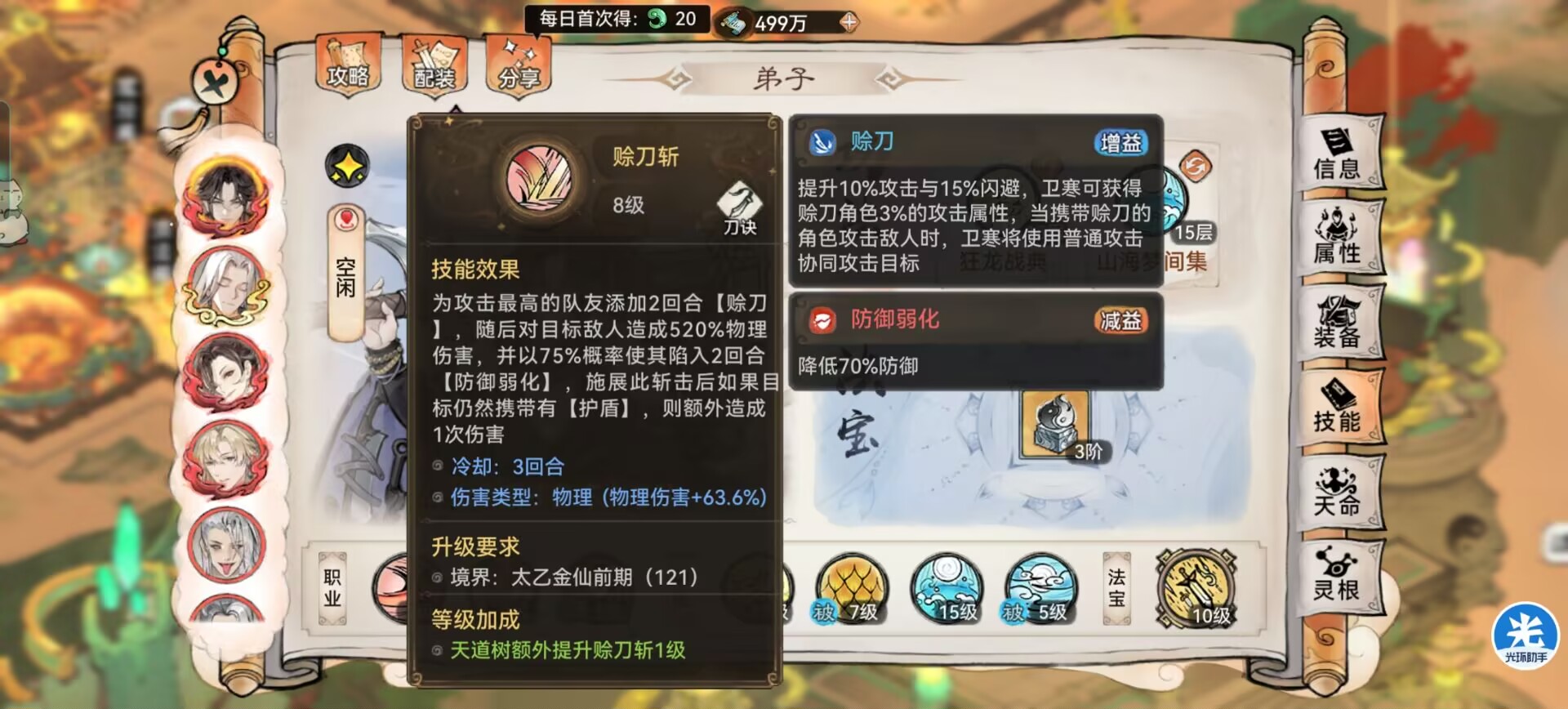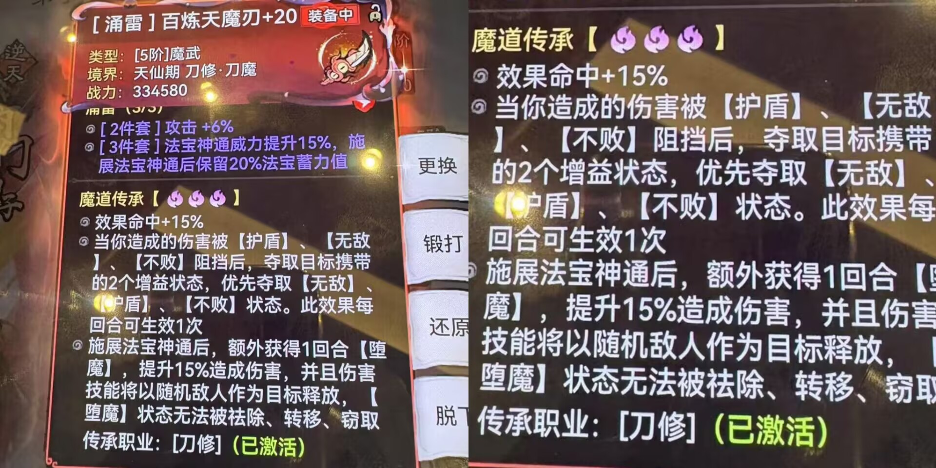 ③凝练三阶:施展法宝神通后,额外获得1回合的【堕魔】效果,提升自身15%的伤害,这个效果无法被祛除、转移、窃取。