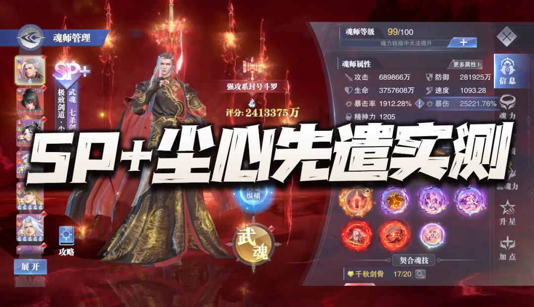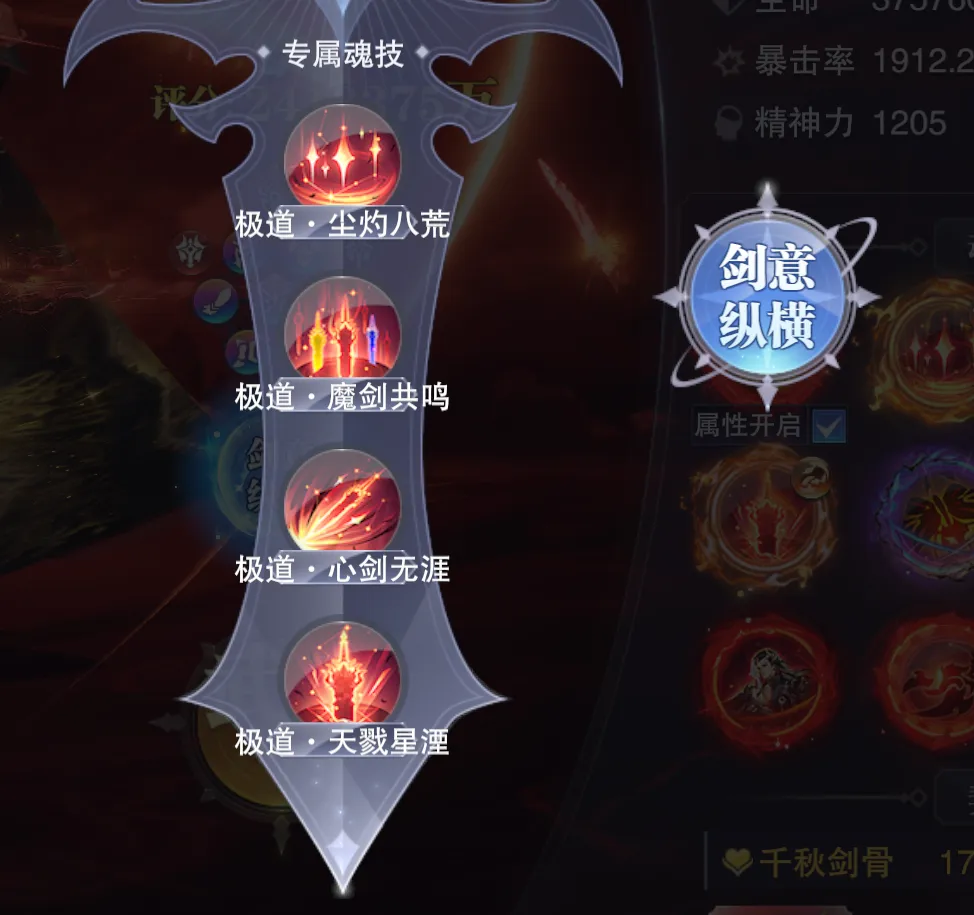 接着在昨天的攻略中维一也说了,SP+尘心没有常规强攻系魂师所谓的猛兽系和巨蝎系魂环的区分,大家直接随便带个强攻系的高练度魂环即可,他的技能差异更多是来自于“剑意纵横”按钮中的天赋树系统。