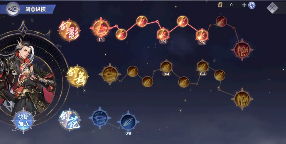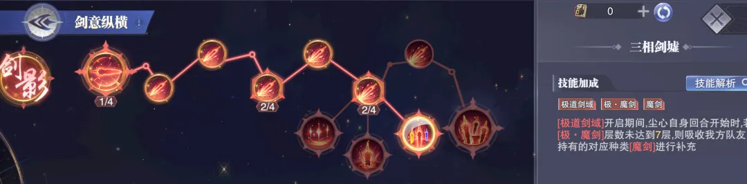 • 红色分支“剑影”:更聚焦于PVE副本,其中关键为第1个节点下需要由3个专属魂骨的星级效果才能激活的快速输出能力,这个有点类似于“先机”的效果了;接着是第4个节点下的“极道·七杀束缚”效果,其可以开启领域效果;最后则是第6个节点下的“三相剑墟”效果,其可以大幅提升开启领域后的伤害