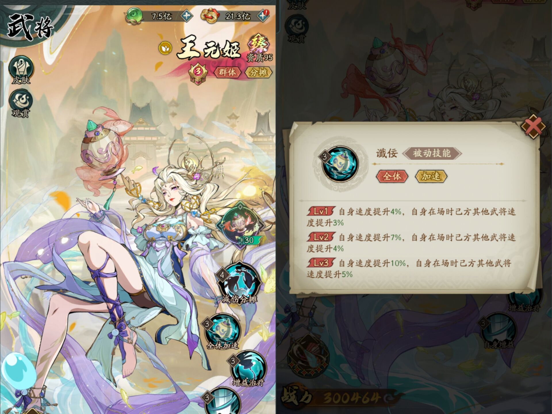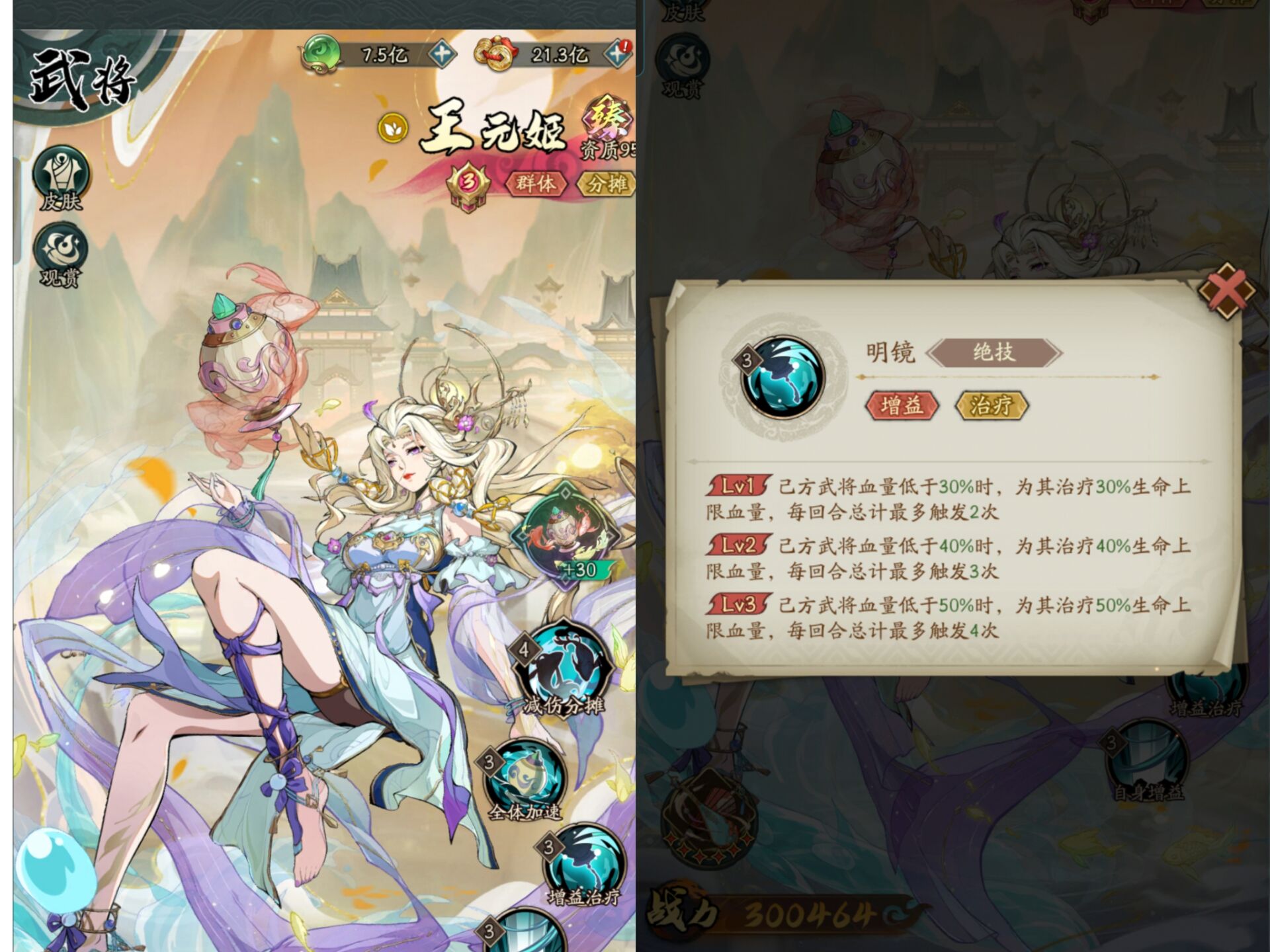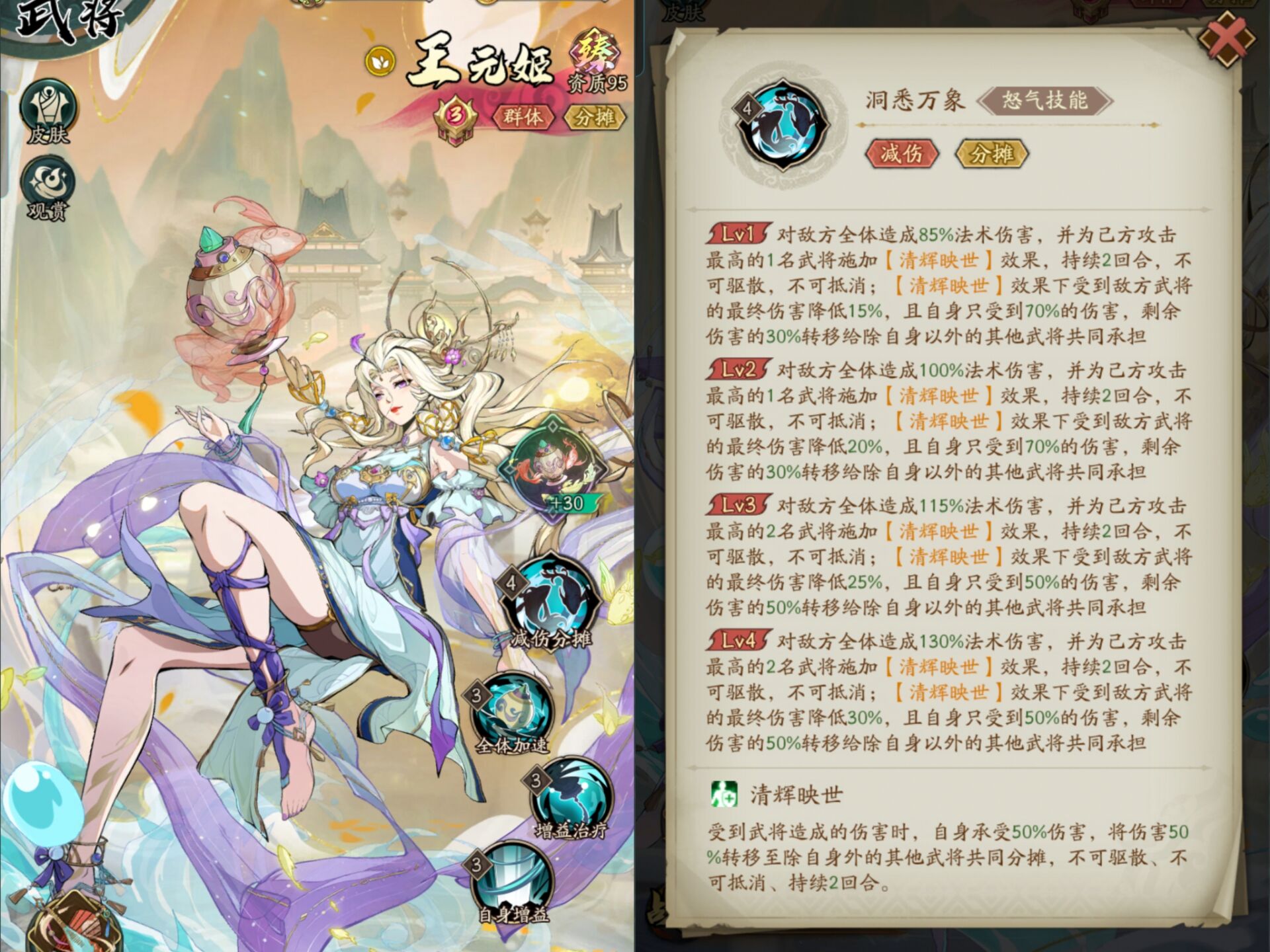 王元姬的怒气技能主要效果就是:【分摊伤害】和【减伤】。