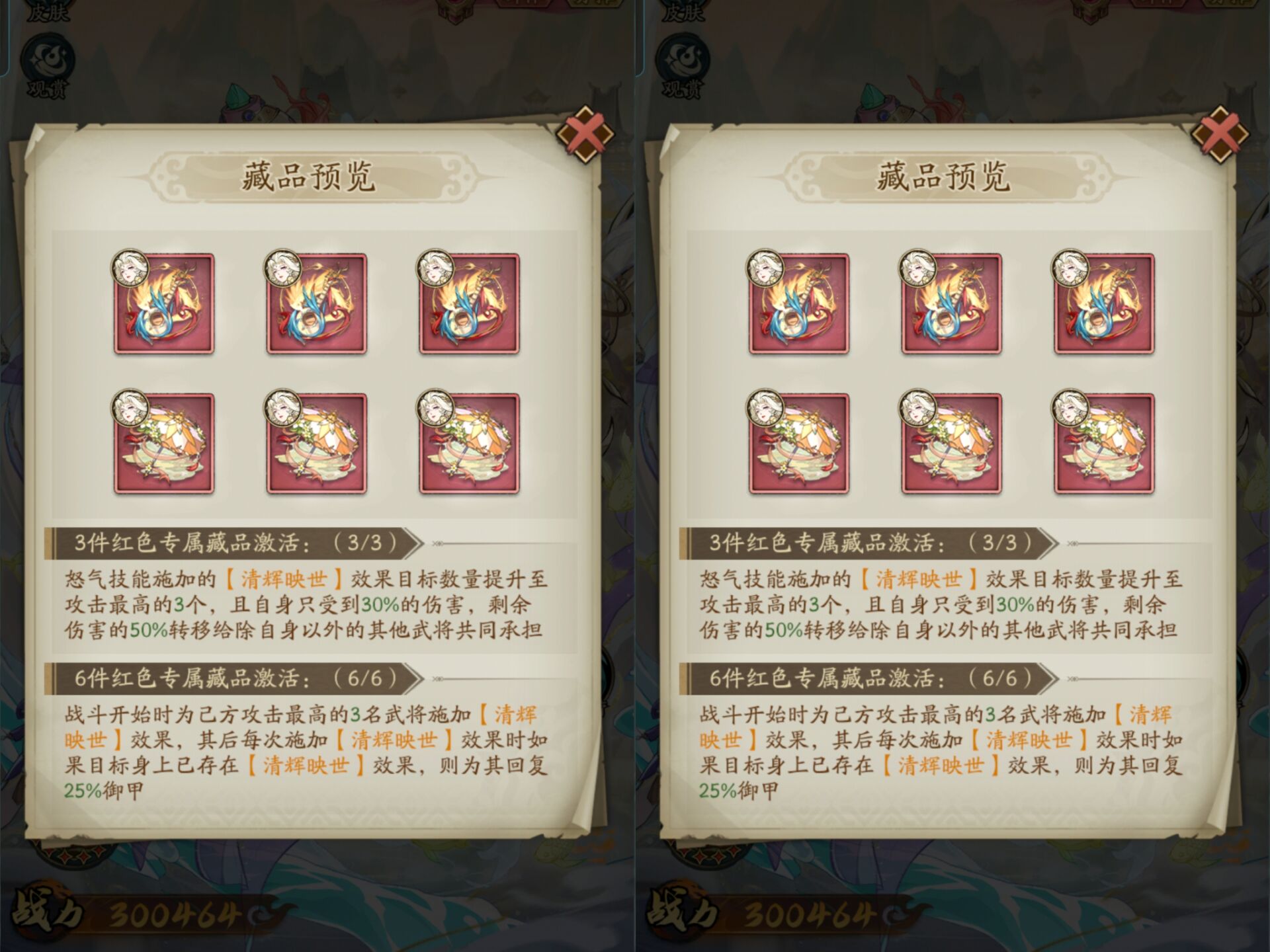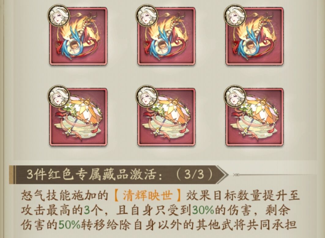 ①3红藏品:进一步加强【清辉映月】的效果。从对2名队友生效变为3名队友!而且自身受到的伤害可以再次降低,加强了自身的生存力。