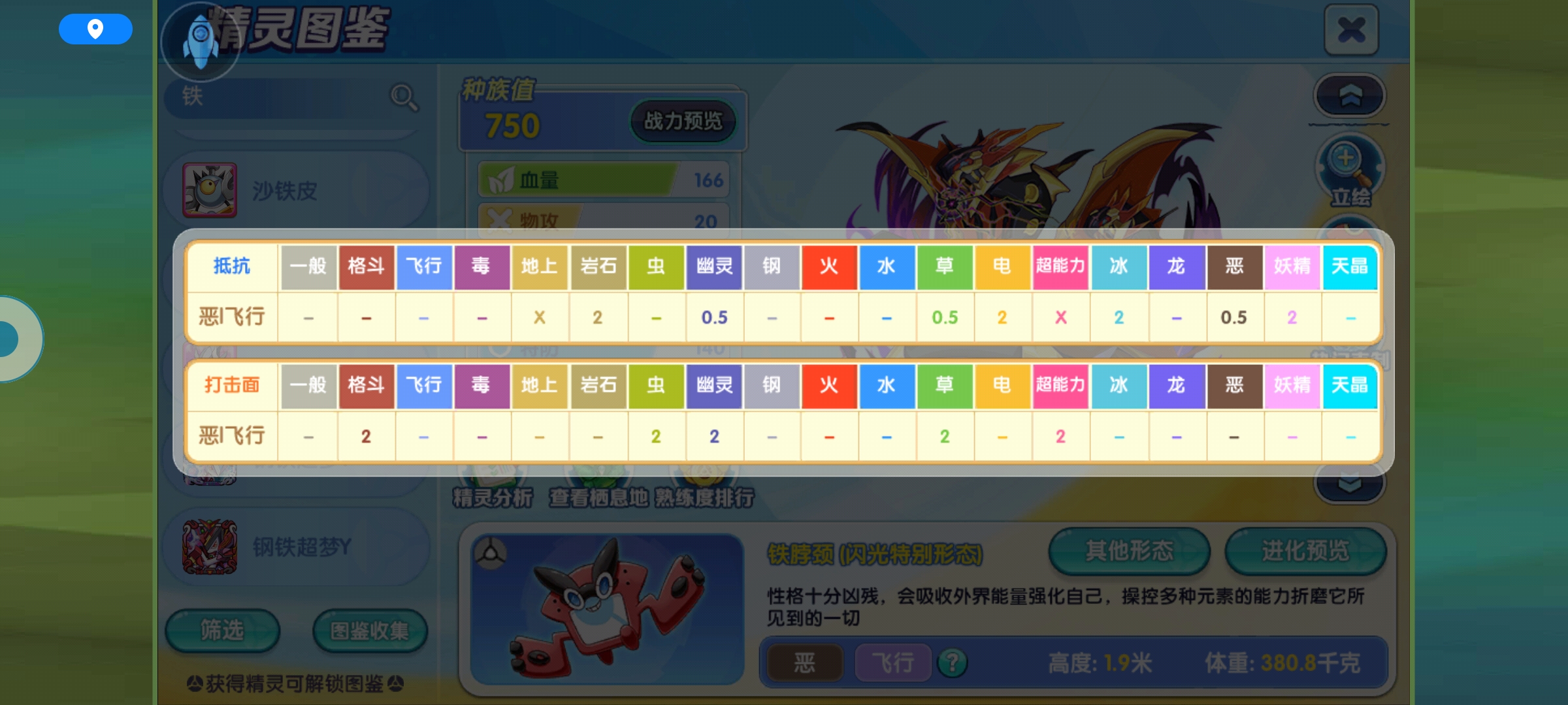 恶+飞行属性在版本上优势并不突出,拥有岩石、冰、妖精、电等多个主流属性的弱点,遇到豹子、急冻鸟、苍响等主流的精灵时,会略显弱势,但是自身凭借特性也可以过过招,免疫地面系与超能系,抵抗幽灵系、草系、恶系。其他都是一倍,这属性说不上多好但好歹也不差,免疫的两个属性都是对局中常遇到的,抵抗的三个属性虽说热度不是太高但好歹还是能遇到,配合上特殊的特性,肉度上还是有所保障的,运用得当则能成为弥补队伍弱点的得力助手,打击面上,恶+飞行没有盲点打击面,面对任何精灵都有可以联想的发挥空间,搭配其独有的强大技能和特性附加三属性伤害,铁脖颈可以和大多主流精灵一决高下。