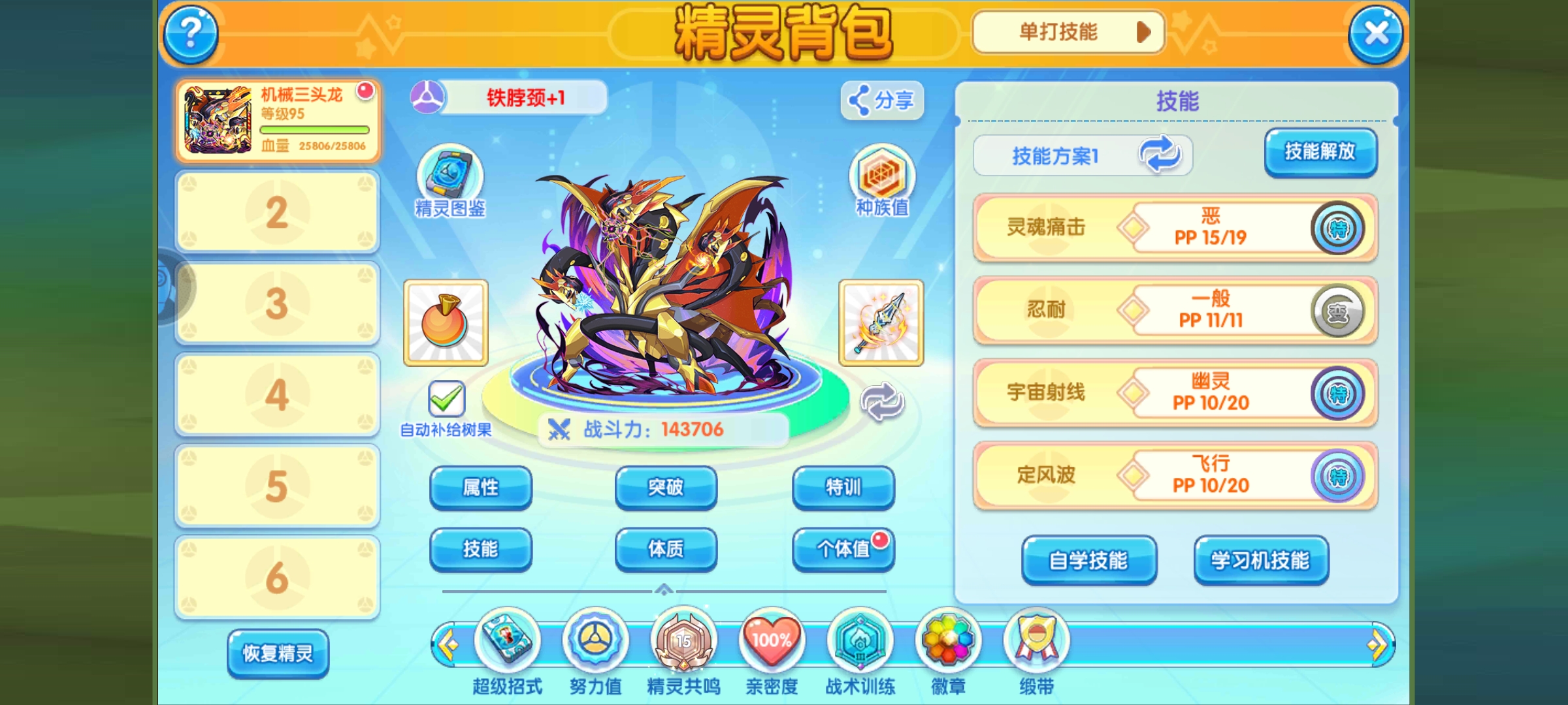 然后高威力技能还有本系灵魂痛击,这个配合它特性给对手附加的异常,即使没有强化能力也能打出非常爆炸的伤害。还有忍耐,这个技能强制保持一血,可以吃伤充能的同时,弥补了生存能力不足的缺点,拥有这个技能时,能让铁脖颈在面对克制的精灵的时候,从容吃伤害充能,因为铁脖颈的充能下场还有,可以后面切走,对战多了后就会让对手忌惮而不敢与之正面交锋,否则会让铁脖颈直接充能。还有龙波,强力的先制效果无视蝶蝶的光粉和精神场地以及骗术空间等环境影响,关键时候的爆发非常关键。