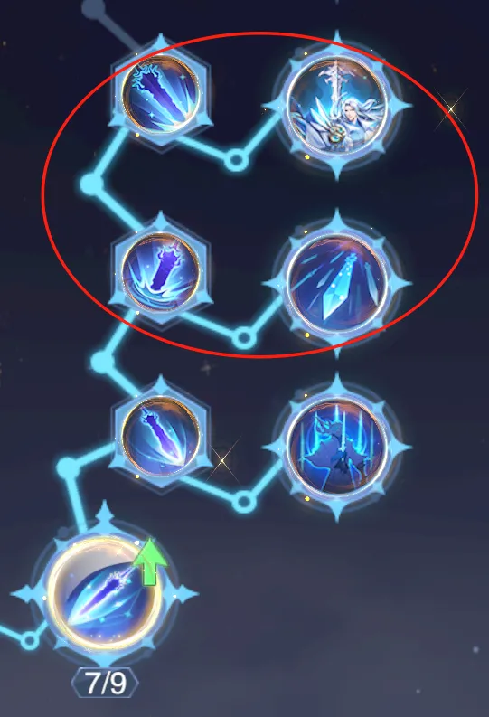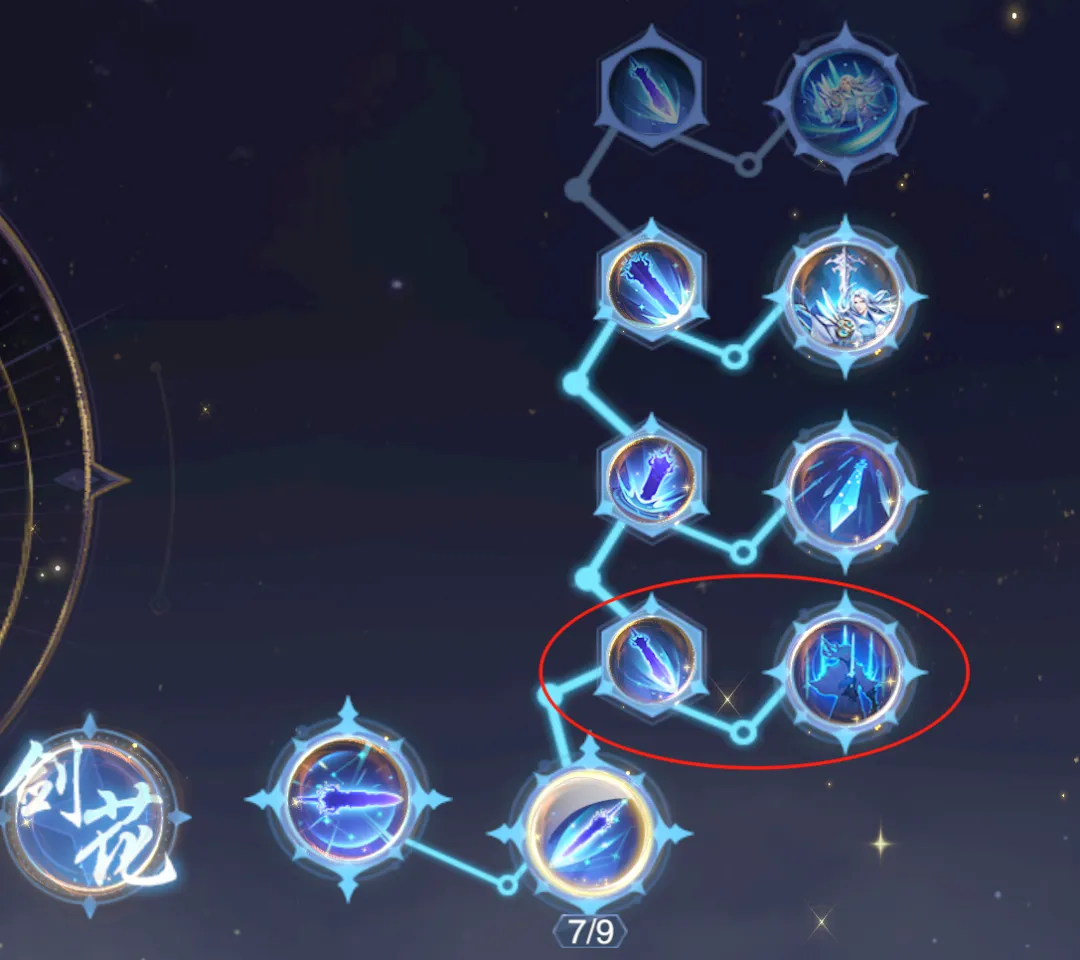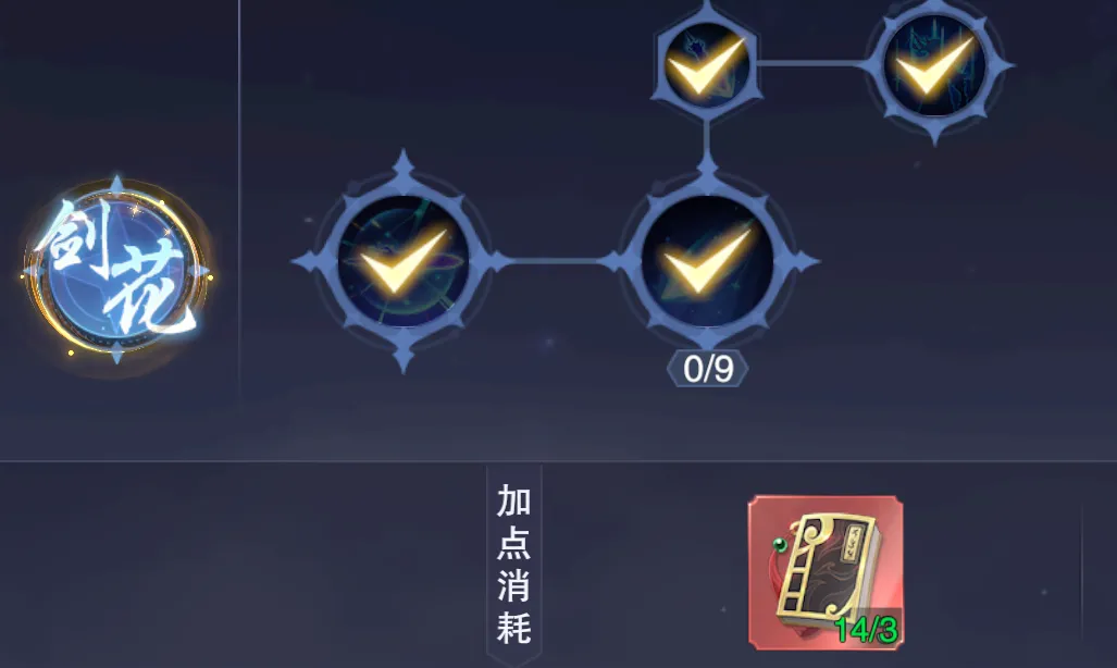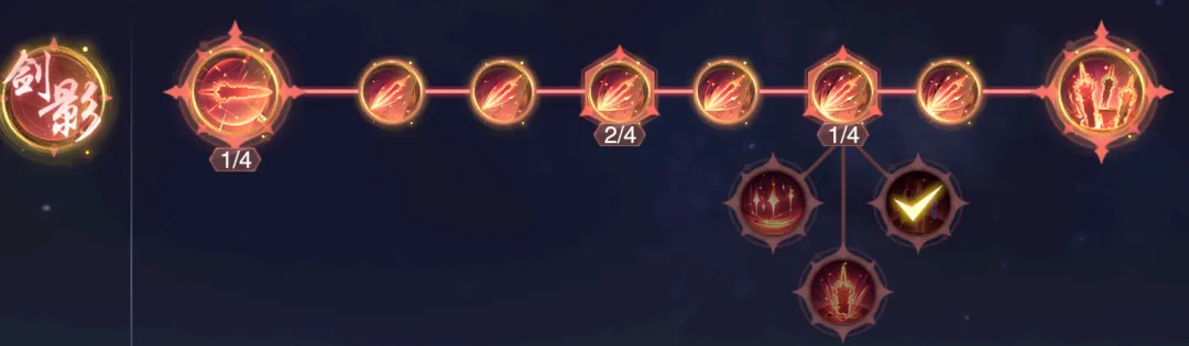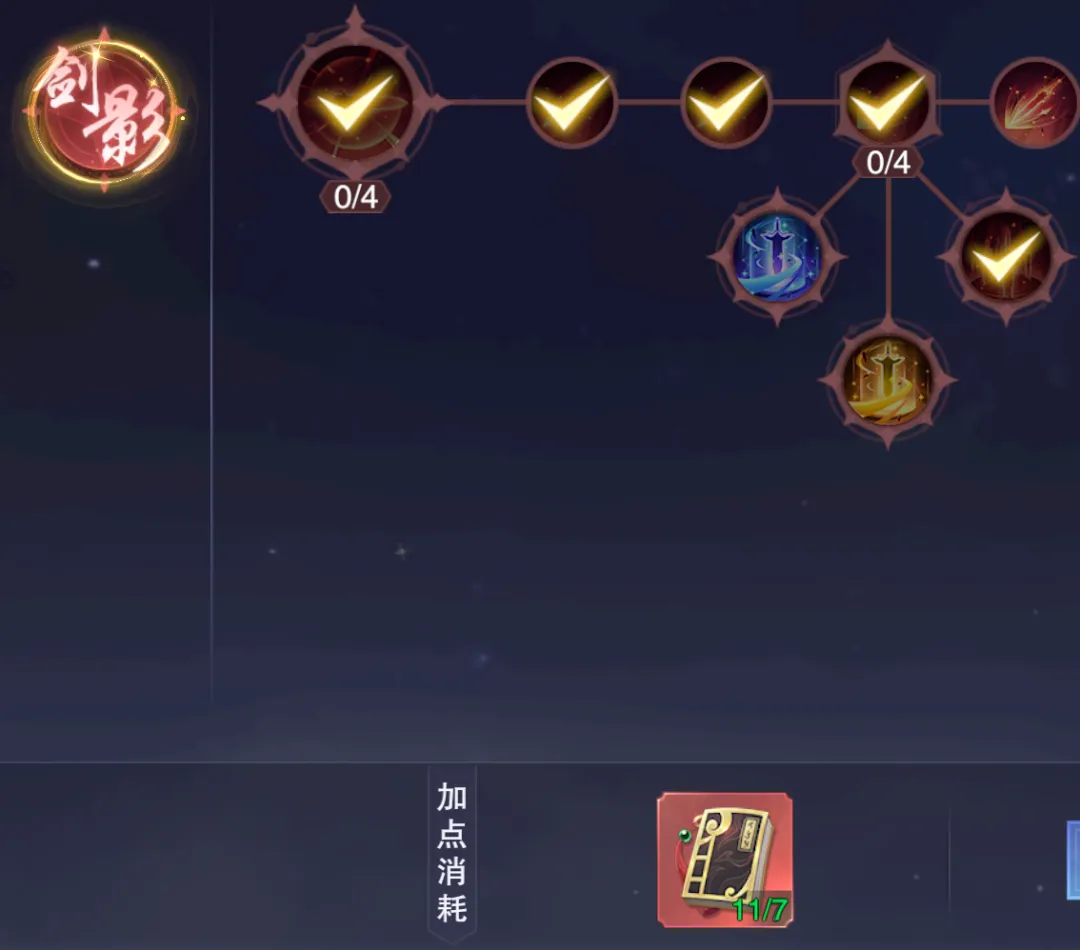 第二部如上图所示,再把红色“剑影”中的前4个加点和第4个加点中的第3个能触发“领域”效果的分支给点出来,这儿加上第一步的3个加点共计会消耗10个加点。